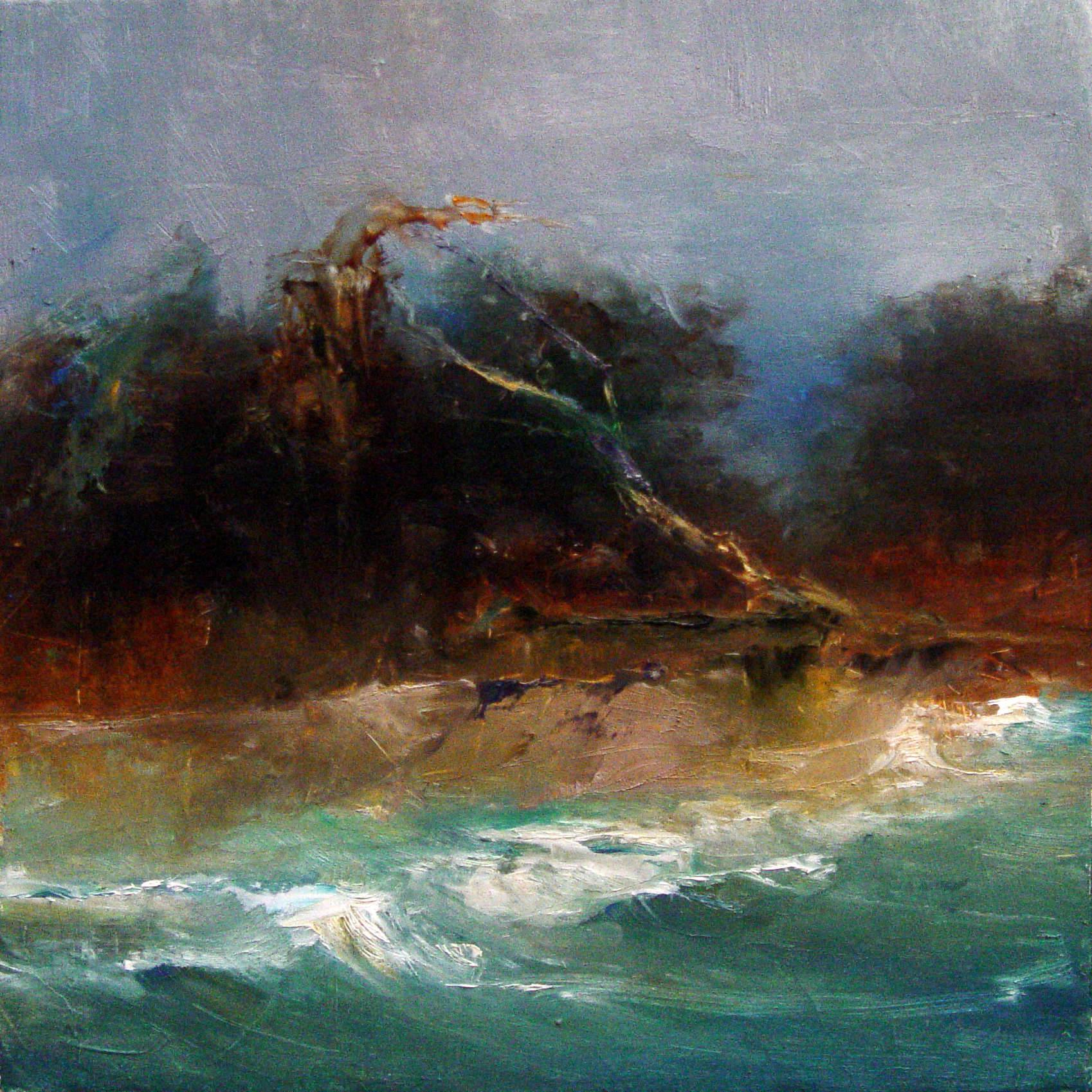 Obraz na pierwszy rzut oka przyciąga uwagę burzliwą scenerią. Woda szaleje na pierwszym planie, malowana dynamicznymi, wirującymi pociągnięciami pędzla. Zielonkawe i niebieskie odcienie kontrastują z ciemniejszym tłem, które zdaje się być tajemniczym, nieco niepokojącym pejzażem. Brązy i czerwienie skrywają się tam w mgławicy kształtów, które trudno jednoznacznie zidentyfikować. Artysta zastosował technikę impasto, nadając kompozycji głębokość i fakturę. Całość spowija atmosfera tajemnicy i niepokoju, jakby przeczuwając nadejście czegoś niezwykłego. Ten obraz mógłby być częścią historii o dzikiej przyrodzie, może nawiedzonym lesie nad brzegiem wzburzonego morza. Czuć energię natury, nieskromną i nieposkromioną. "Look out!" zdaje się krzyczeć fala, przywołując niespokojne emocje. Obraz przyciąga uwagę, z jednej strony dając wrażenie chaosu, a z drugiej - fascynującego spokoju zawieruchy. Tak by powiedzieć, wzbudza emocje, które są trudne do opisania jednym słowem. Może to strach przed nieznanym, a może podziw dla potęgi przyrody. To dzieło, które można by interpretować w nieskończoność. Prawda?