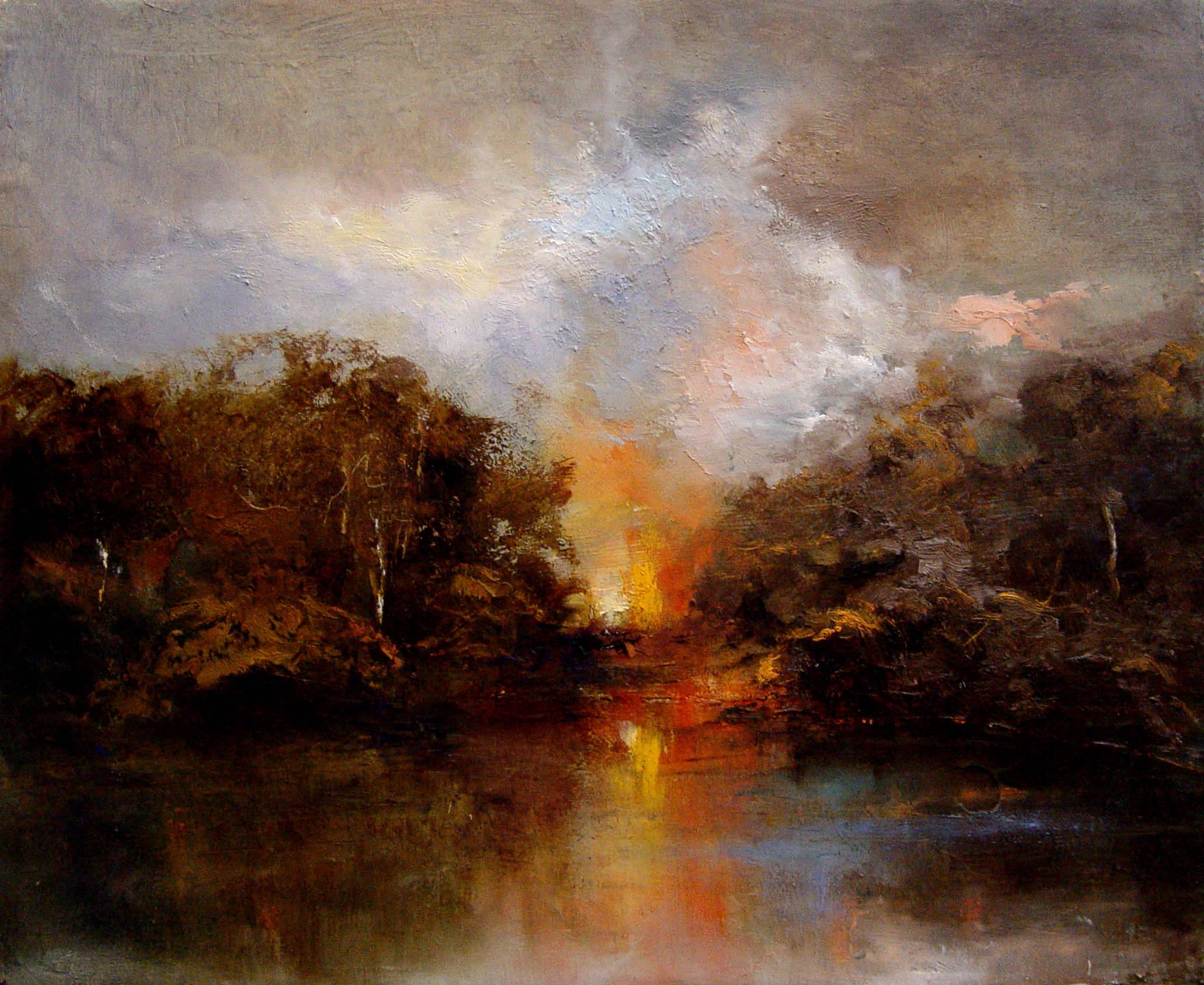 Ten obraz to istna eksplozja kolorów i emocji. Centrum kompozycji przyciąga wzrok ognistym oranżem i czerwienią, które płynnie rozlewają się po chmurach i lustrzanej tafli wody. Wszystko otulone jest przez ciemne, gęsto osadzone drzewa o nieco niepokojącym wyglądzie, tworząc atmosferę tajemnicy. Co tam się dzieje? Może właśnie zaczyna się jakiś magiczny spektakl? Obraz wykonany jest w stylu romantycznym, gdzie artysta bawi się fakturą, nakładając farbę grubymi pociągnięciami pędzla. To coś jakby malowanie emocji, gdzie każde spojrzenie odkrywa nową warstwę interpretacji. Patrząc na dzieło, czujesz się jak wciągnięty w nieznaną opowieść, pełną napięcia i wewnętrznego blasku. Zastanawiam się, co autor miał na myśli tworząc ten obraz. Widoczna jest tu także technika impasto, która dodaje głębi i dynamiki, a gra świateł sprawia, że nie można oderwać wzroku. Mam wrażenie, że to miejsce, gdzie można spotkać wróżkę lub złotą rybkę. I ja bym się nie zdziwił! To jedna z tych chwil, gdy art udało się zamknąć w ramach płótna coś ulotnego. Obraz przypomina mi, że sztuka to magia. Wow, tak to jest kiedy jeden obraz więcej mówi niż tysiąc słów.