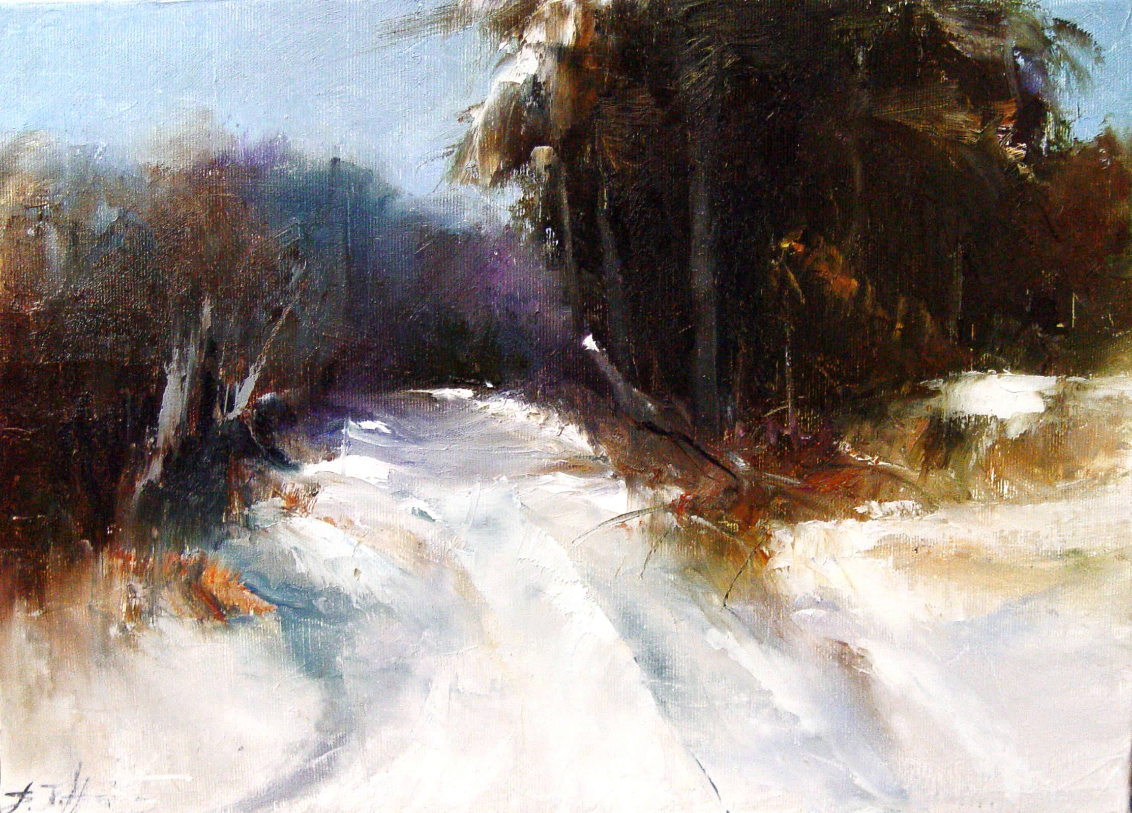 Obraz przedstawia zimowy krajobraz z delikatnym, bladym światłem przebijającym się przez zasłonę drzew. Dominują tu chłodne barwy: biel śniegu subtelnie przechodzi w odcienie szarości i błękitu nieba. Ciemne, niemal czarne kształty drzew po prawej stronie tworzą kontrast, przywodząc na myśl tajemnicę lasu. Kompozycja jest dynamiczna; ścieżka w śniegu przyciąga wzrok i prowadzi w głąb obrazu. Artystyczny styl jest dość luźny, z wyraźnymi pociągnięciami pędzla. Technika impasto dodaje teksturze i głębi, dzięki czemu czujemy, jakbyśmy mogli niemalże dotknąć śniegu. Nastrój tego dzieła jest chłodny, ale jednocześnie uspokajający, jakby świat zamarł na chwilę w bezruchu. Obraz może wywoływać różnorodne emocje. Dla jednych to spokój zimowego poranka, dla innych – lekka nostalgia za minionym czasem. Hej, to wygląda jak lodowisko! – mogłoby powiedzieć 7-letnie dziecko, widząc białą ścieżkę. Dla mnie osobiście to przypomnienie cichych spacerów na łonie natury, gdy wszystko wydaje się możliwe. To dzieło to magiczna winter wonderland, gdzie zasmakujemy spokoju i chłodu zimowej przygody.