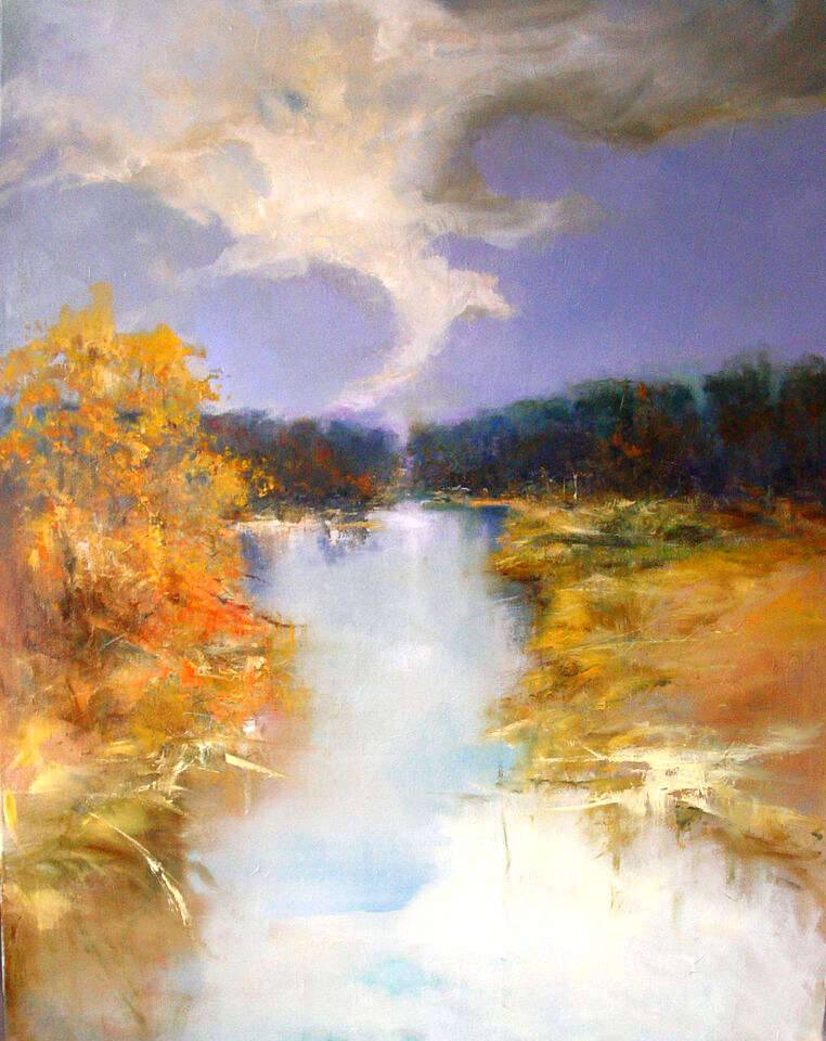 Na obrazie widać rzekę wijącą się przez złocistą przyrodę. Kolory są ciepłe, dominuje tu złota jesień, z domieszką rdzawych i pomarańczowych tonów. Horyzont zamyka ciemny las, przywołując aurę tajemnicy. Niebo pokrywają dramatyczne chmury, które nadają dziełu dynamiki. Obraz emanuje spokojem, ale i pewnym napięciem, jakby zapowiadał coś niezwykłego. Technika, której użyto, to prawdopodobnie impresjonizm – widoczny po lekkich, płynnych pociągnięciach pędzla. Ta "softness" koloru sprawia, że odbiorca czuje się jak w marzeniu. Patrząc na ten obraz, można odczuć nostalgię za mijającymi dniami, a jednocześnie zachwyt nad pięknem natury. Wyobrażam sobie, że to miejsce, gdzie czas zwalnia, a my możemy oddać się refleksji. Obraz przypomina mi o spacerach po lesie w dzieciństwie, kiedy zbierałem kolorowe liście. A może te chmury zwiastują nadchodzącą burzę, która przyniesie odświeżający deszcz? Jest w tym coś bardzo emocjonującego, co trudno opisać jednym słowem. W takim pejzażu można się zakochać na nowo. Atmosfera jest pełna subtelnych kontrastów, które sprawiają, że nie można oderwać wzroku. Jak to mówi się, każdy widzi w obrazie to, co chce widzieć, a ten zdecydowanie zachęca do snucia własnych historii.