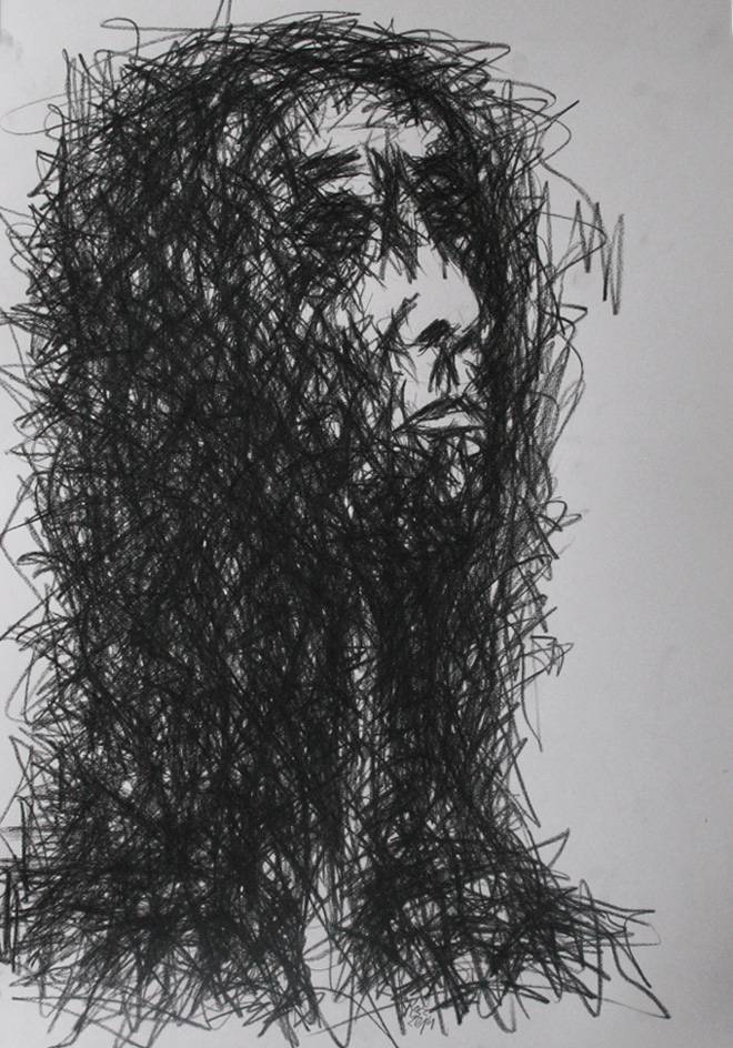 Obraz przyciąga wzrok chaotyczną plątaniną czarnych linii, które tworzą sylwetkę tajemniczej postaci. Dominująca czerń na jasnym tle tworzy dramatyczny kontrast, podkreślając uczucie mrocznego niepokoju. Linie są jak wiry, przypominając emocjonalny rollercoaster, w którym łatwo się zagubić. Krzyżujące się kreski, jakby ktoś rysował w gniewie, tworzą niejasny, ale wyrazisty wizerunek, który fascynuje i intryguje. Atmosfera obrazu jest ciężka, trochę jak burza emocji. Patrząc na niego, trudno pozbyć się uczucia niepokoju i zagubienia. Styl jest nieco abstrakcyjny, a technika, którą posłużył się artysta, sugeruje spontaniczność i brak ograniczeń, jakby kartka była polem bitwy emocji. Całość przypomina artystyczny "sketch" pełen namiętności i ulotnych myśli. I choć obraz emanuje pewnym chaosem, ma w sobie coś hipnotyzującego. Może zmuszać do refleksji nad własnym wewnętrznym światem, pozostawiając wiele miejsca na dowolną interpretację. Widząc ten obraz, można odczuć zarówno smutek, jak i fascynację jego dynamiczną formą. Dziecko mogłoby powiedzieć: "To wygląda jak bałagan na kartce!" A ja czuję, że to jak wyraz walki z wewnętrznymi demonami. Ten obraz jest naprawdę "captivating", choć może też trochę przytłaczać swoim intensywnym wyrazem.