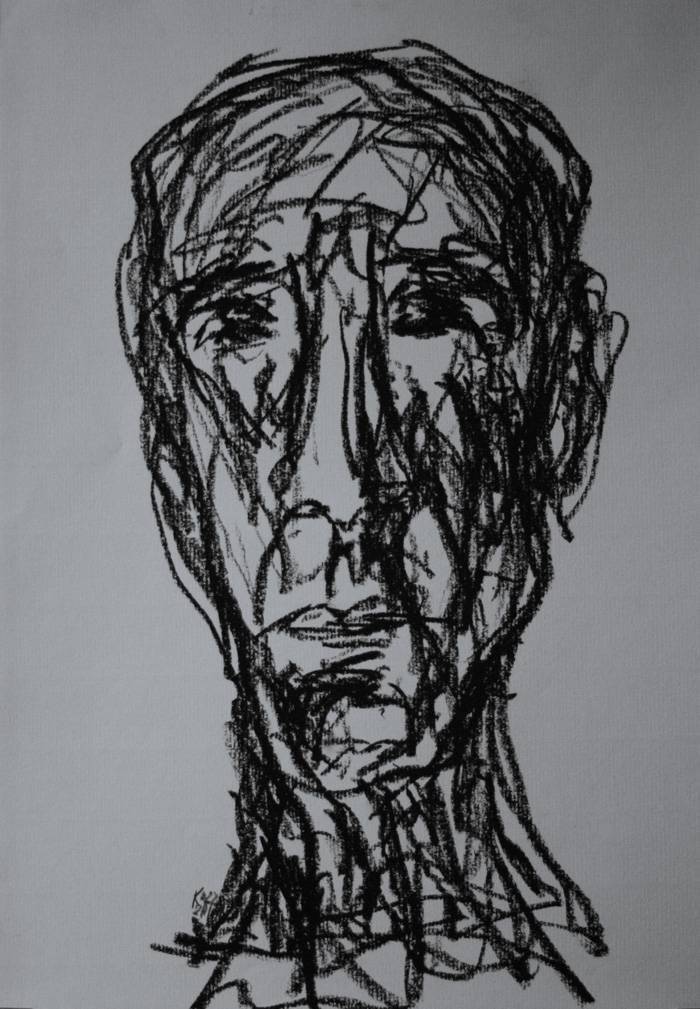 Obraz przedstawia twarz naszkicowaną z plątaniny czarnych linii na szarym tle. Linie, choć chaotyczne, tworzą wyraźny zarys męskiej twarzy. Kształty są organiczne, przypominając splątane gałęzie drzewa. Atmosfera dzieła jest ciężka, niemal melancholijna. Można poczuć, jakby postać na obrazie skrywała jakąś tajemnicę. Technika artystyczna to zdecydowanie szkic. Artysta operuje ciemnymi, ekspresyjnymi kreskami, co nadaje ilustracji surowy charakter. Patrząc na ten obraz, można poczuć zaniepokojenie lub zrozumienie dla złożoności ludzkich emocji. Niektórzy mogą widzieć smutek, inni spokój w tych oczach. Dlaczego on taki smutny? Zastanawia się pewnie nie jedno dziecko. Styl to coś jakoby między abstrakcją a portretem. Choć formalnie niewyszukany, jest engaging i pokręcony jak labirynt. Linia prowadzi wzrok po całej twarzy, a całość ma niemal hipnotyczny klimat. Czułam, jakbym patrzyła na emocje samego życia, uwięzione w tym prostym, a jednak skomplikowanym szkicu. Fascynujące, jak jeden doodle potrafi tak przyciągnąć uwagę.