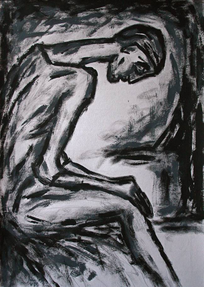 Obraz emanuje surową emocją, oszałamia prostotą czarno-białych kontrastów. Ciemne, ekspresyjne pociągnięcia tworzą postać osoby siedzącej w zamyśleniu. Kształty są niedokładne, jakby malowane w pośpiechu, ale to właśnie dodaje uroku temu dziełu. Te dynamiczne linie i cienie wirują wokół postaci, wzmagając poczucie niepokoju i introspekcji. Atmosfera jest ciężka, niemal przytłaczająca. Ale jest to rodzaj obrazu, który sprawia, że chce się na niego patrzeć i myśleć o życiu. Taki styl, pełen spontaniczności, przypomina technikę ekspresjonistyczną. Artysta użył jedynie pędzla i tuszu, żeby oddać głębię emocji. Czasem mam wrażenie, że ten obraz "krzyczy" w milczący, samotny sposób. "Jakbym się zgubił," powiedziałoby może dziecko. Można by rzec, że to przedstawienie zagubienia i poszukiwania odpowiedzi, które nie zawsze są widoczne na pierwszy rzut oka. Czy to smutek, samotność, a może tylko zwyczajne zamyślenie? Niezależnie od interpretacji, obraz ten jest zaproszeniem do deep thought i osobistej refleksji. Sprawia, że chcesz usiąść i pogrążyć się w myślach.