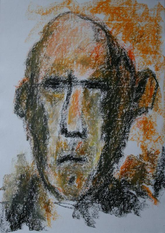 Obraz przedstawia twarz, której kształty są nieco zamazane, co dodaje tajemniczości i niepewności całej kompozycji. Dominująca kolorystyka utrzymana jest w ciepłych odcieniach pomarańczu i brązu, które przypominają jesienne liście. Twarz wydaje się skoncentrować całą swoją uwagę na nas, co może budzić pewien niepokój, a może i zadumę. Całość jest wykonana w technice pasteli, gdzie ekspresyjne pociągnięcia kredki tworzą dynamiczne faktury. Styl artysty jest surowy, niemal szkicowy, jakby chciał powiedzieć: "hej, zobacz, to tylko zarys, resztę sam dopowiedz". Takie podejście pozwala odbiorcy interpretować dzieło na własny sposób, co jest fascynujące. Obraz może wywoływać różne emocje: od niepewności, przez smutek, aż po ciekawość. Można pomyśleć, że patrzymy na kogoś, kto przeszedł przez wiele "ups and downs" życiowych i jego twarz jest tego świadectwem. Dla mnie ten obraz ma coś z dziecięcej prostoty, może dlatego przypomina mi rysunki, które widywałem w szkolnych zeszytach. Jak mówił mój młodszy brat: wygląda, jakby płomień zatańczył na kartce. Właśnie to połączenie chaotycznych kształtów i kolorów zachwyca i przyciąga. Obraz jest jak tajemnica, której chcemy się przyjrzeć z bliska, uchwycić jej essence.