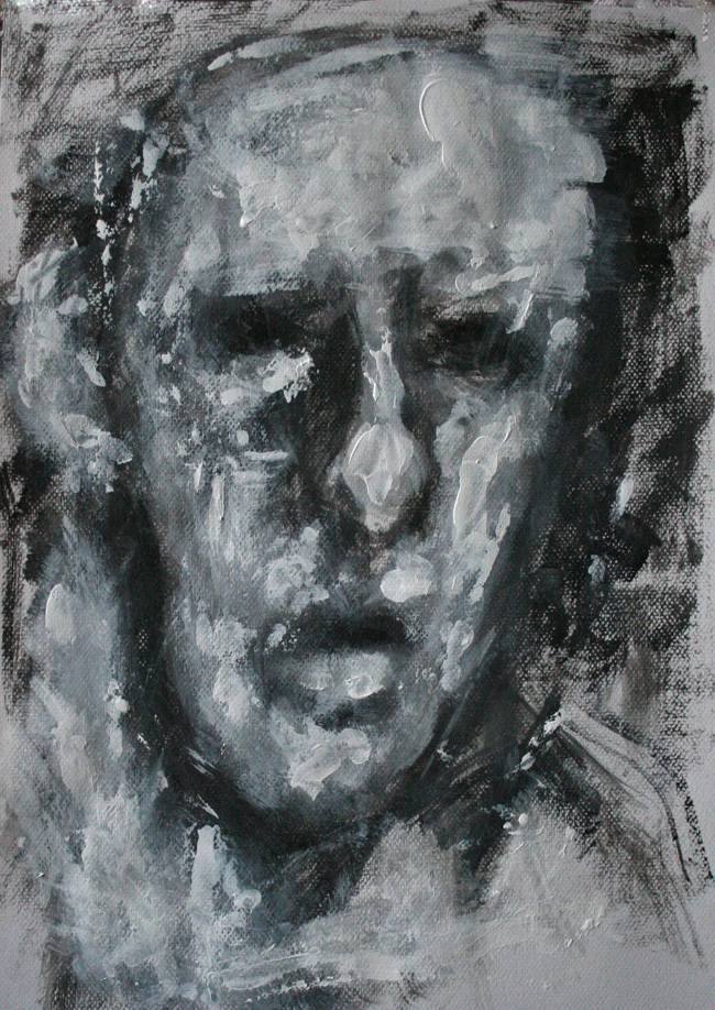 Ten obraz przedstawia enigmatyczną ludzką twarz, ukazaną w zadziwiający sposób. Odcienie szarości tworzą poczucie głębi, z dominującymi bielami i czernią, które malują subtelne kontury i cienie. Całość kompozycji zdaje się być zamglona, jakby spowita delikatnym woalem, co wprowadza nastrój tajemnicy i niepokoju. Obraz zdaje się oddziaływać na wyobraźnię, pozostawiając wiele do interpretacji. Artysta zastosował technikę impasto – grube warstwy farby nadają powierzchni niemal rzeźbiarski charakter, a tekstura płótna jest wyraźnie widoczna. Chłodny nastrój obrazu może wzbudzać u widza różne emocje. Dla mnie to trochę jak patrzenie na czyjąś duszę przez okno smutku. Może to być nie tylko medytacja nad samotnością, ale też nad utratą. Dlaczego ten człowiek jest taki smutny? Styl obrazu jest minimalistyczny, prawie jakby artysta chciał, żebyśmy skupili się tylko na emocjach. Obraz działa trochę jak śnieg na telewizorze – coś prostego, ale jednocześnie hipnotyzującego (czy to make sense?). Dzieło skłania do refleksji – nad człowieczeństwem, nad ulotnością chwili, nad tym, co ukryte pod powierzchnią. Dla mnie to piękny i poruszający kawałek sztuki. Patrząc na niego, można poczuć tę specyficzną więź z tym, co nieznane i nieuchwytne.