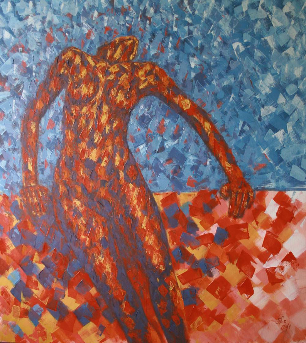 Na obrazie dominują intensywne kolory: głęboki błękit nieba i energetyczna czerwień sylwetki, które przyciągają wzrok. Forma postaci jest dynamiczna, z wyraźnymi, geometrycznymi kształtami. Artysta użył techniki impasto, dzięki której faktura farby jest wyjątkowo namacalna. No, muszę przyznać, to wygląda jak świetna zabawa farbami! Atmosfera dzieła jest intrygująca i nieco tajemnicza. Jasne barwy dodają mu energii, a sposób, w jaki elementy się przenikają, wprowadza pewien chaos. Ale taki dobry chaos. Styl przypomina impresjonizm z domieszką ekspresjonizmu – spontaniczne pociągnięcia pędzla nadają uczucia i emocje. Może symbolizować wewnętrzną walkę czy poszukiwanie siebie. I to jest naprawdę fascynujące. Możesz poczuć zew przygody albo głęboką refleksję. Taki obraz może zmusić do myślenia. Warto podziwiać te detale i docenić siłę koloru w przekazie artystycznym. Life pełne emocji i barw.