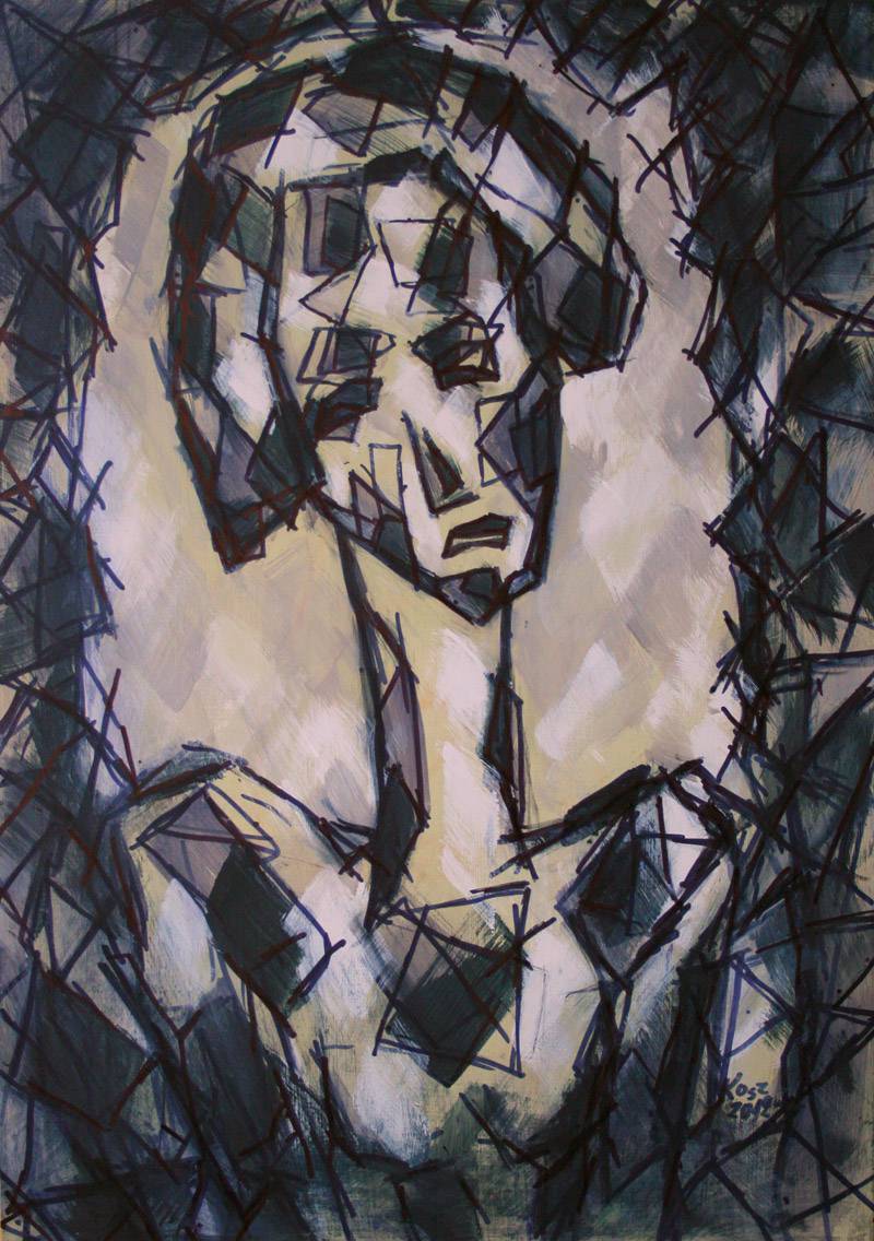Obraz przedstawia abstrakcyjne przedstawienie postaci, utkane z geometrycznych kształtów i ciemnych linii. Kolory są stonowane, dominują odcienie szarości, błękitów oraz biel. Artysta eksperymentuje z kompozycją, tworząc dramatyczne kontrasty między światłem a cieniem. Postać w centrum wydaje się enigmatyczna, a może nawet trochę smutna, co nadaje obrazowi pewną melancholijną atmosferę. Styl dzieła przypomina ekspresjonizm z nutą kubizmu, gdzie figura rozszczepia się na kanciaste elementy, jakby była puzzlem. Technika, jaką zastosowano, to pewne i dynamiczne pociągnięcia pędzla oraz wyraźne kontury, co sprawia, że obraz ma unikalną teksturę. Wow, to wygląda jak mozaika z nietypowych klocków! Podejście artysty do tematu sugeruje głębszą refleksję nad ludzką tożsamością i emocjami. Obraz może budzić w widzu różne emocje – od zadumy po niepokój. To prawdziwy "eye-catcher", który zmusza do chwili zatrzymania się i zastanowienia. Dla mnie, patrząc na niego, czuję tajemnicę i pewną nostalgię. Może ktoś inny zobaczy w nim coś optymistycznego? Każdy widz przynosi swoje własne interpretacje, co czyni ten obraz fascynującym polem do osobistych odkryć. Szorstkość linii i zamglone kolory są po prostu captivating.