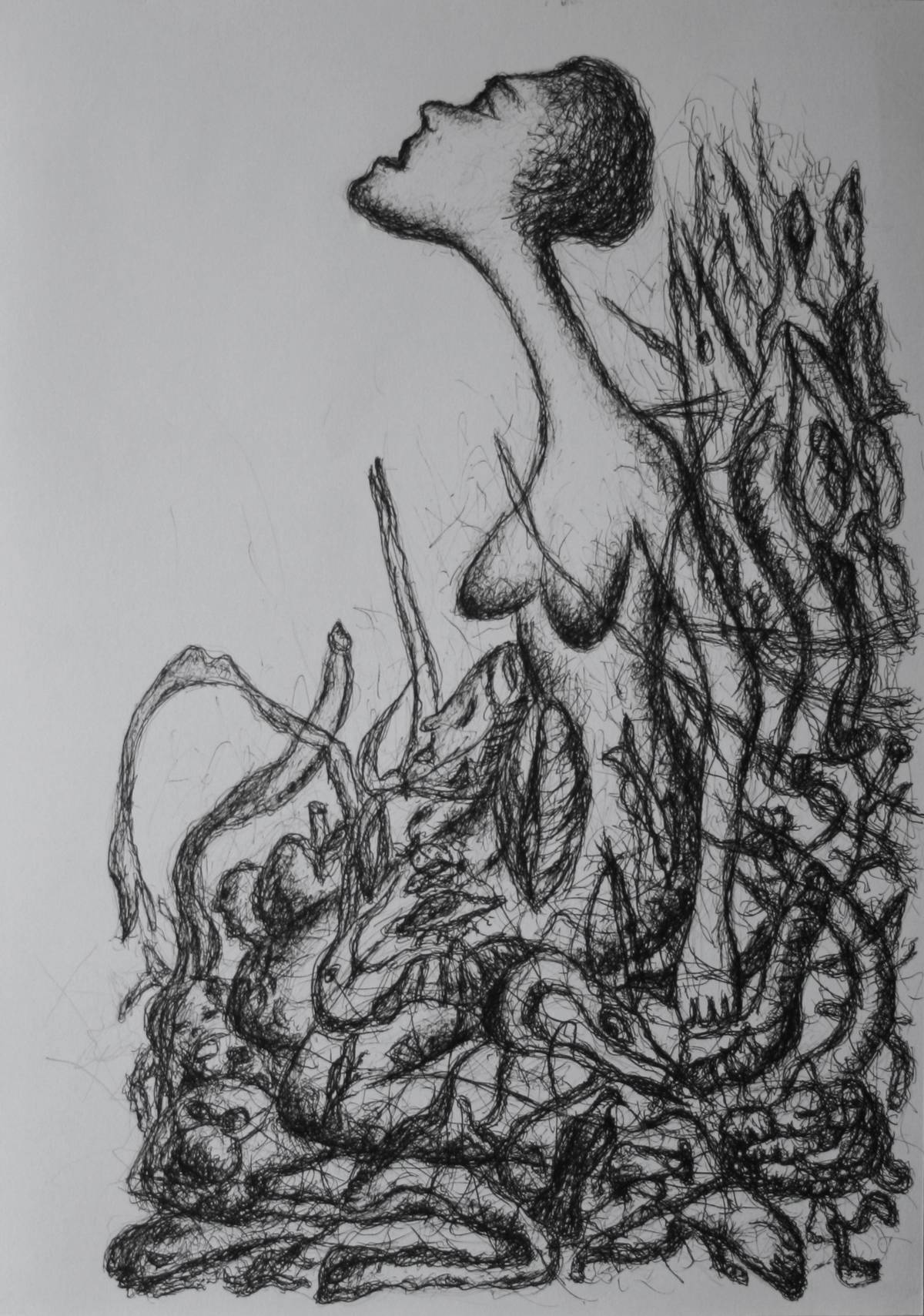 Obraz przywodzi na myśl surrealistyczny sen. Postać z wyciągniętą szyją wznosi głowę ku górze, zanurzona w gąszczu organicznych form. Przewijają się tu splątane linie i ciemne kształty. Artysta sięgnął po technikę rysunku tuszem, co dodaje surowości i intensywności. Czarny kontur na białym tle tworzy dynamiczny kontrast, przyciągając wzrok. Kolory są ograniczone do monochromatycznej palety, co wzmacnia uczucie niepokoju. Atmosfera jest nieco niepokojąca, jakby coś nieuchwytnego ukrywało się w zawiłych liniach. To nie jest obraz, który ogląda się po prostu. To experience, które prowokuje myślenie. Styl rysunku przypomina doodle’owe szkice, pełne detali i nieoczywistej struktury. Każda linia zdaje się prowadzić donikąd i wszędzie jednocześnie. Obraz wywołuje mieszane emocje, od fascynacji po niepewność. Można dostrzec w nim chaos i harmonię jednocześnie, co czyni go intrygującym. Czy to przedstawienie walki z wewnętrznymi demonami? A może poszukiwanie wolności? Myślę, że każdy widz odnajdzie w nim coś innego. Ja widzę tu próbę wyzwolenia z czegoś, co pochłania powoli. Małe dziecko powiedziałoby może to jest dziwne, ale fajne! To dzieło niesie ze sobą pytanie o sens istnienia i konfrontację z własnymi lękami.