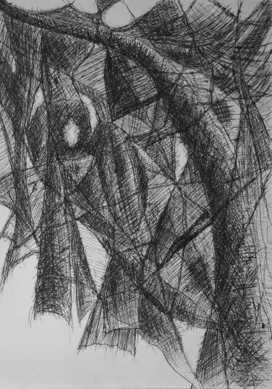 Na obrazie dominuje czarno-biała paleta barw, tworząc mroczny, nieco tajemniczy nastrój. Kształty są abstrakcyjne, przypominające plamy cieni rozciągniętych na powierzchni płótna. Kompozycja jest dynamiczna, złożona z linii przecinających się pod różnymi kątami, co dodaje głębi i ruchu. Artysta zastosował technikę cross-hatching, co dodaje tekstury i skomplikowanej struktury. Ta skomplikowana sieć linii może wywołać w odbiorcy różne emocje, od poczucia zagubienia po fascynację. To jak wplątać się w pajęczynę, z której ciężko się wydostać. Styl jest jednocześnie surowy i finezyjny, co tworzy ciekawy kontrast. Widzowie mogą interpretować dzieło jako symbol chaosu lub wewnętrznych zawirowań. Można poczuć się trochę jak w labiryncie myśli lub emocji, gdzie każda linia prowadzi do nowego zakątka umysłu. Hej, wygląda jak tajemniczy las! Ten obraz może przyciągać swoim enigmatycznym charakterem, zachęcając do odkrywania i refleksji. Gdy spoglądam na niego, czuję lekki niepokój, ale jednocześnie nie mogę oderwać wzroku. To coś więcej niż simple doodle, to podróż w nieznane rejony wyobraźni.