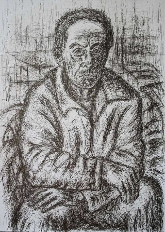 Obraz przyciąga wzrok niebywałą intensywnością linii. Artysta wykorzystał ciemne, wyraziste kreski, które splatają się w chaotyczny, ale jednocześnie precyzyjny sposób. Dominują odcienie czerni i bieli, które tworzą kontrastowy portret mężczyzny. Jego spojrzenie jest przenikliwe, a bruzdy na twarzy zdradzają ciężar doświadczeń. Pomimo braku kolorów, kompozycja tętni życiem, jakoś tak przyciągająca jak klasyczny noir. Atmosfera dzieła jest nieco przygnębiająca, ale nie pozbawiona nadziei. Odczuwa się w niej pewną melancholię, która może kojarzyć się z refleksją nad upływającym czasem. „Wow, ten pan wygląda jak mój dziadek po ciężkim dniu!” – mógłby powiedzieć 7-latek. W tej pracy widać wpływy ekspresjonizmu, gdzie artysta zrywając z formalnymi kanonami, kładzie nacisk na emocje. Technika rysunku przypomina szkicowanie z rozmachem, z pewnym „chaotic energy”, który oddaje charakter postaci. Obraz może budzić różnorodne odczucia. Dla niektórych może być medytacją nad ludzką kondycją, dla innych obrazem samotności. Jest w niej coś osobistego, jakby artysta próbował uchwycić esencję człowieka. Płynne przejścia między formalnym a luźnym stylem podkreślają autentyczność i warsztatową biegłość twórcy.