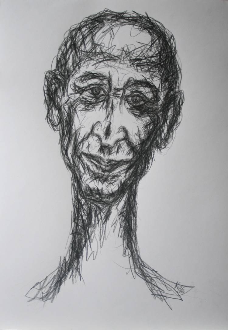 Ten obraz to niesamowite połączenie chaotycznych kresek tworzących portret mężczyzny. Czarna, gęsto nałożona kreska wyraża ruch i intensywność. Postać na rysunku zdaje się patrzeć prosto przed siebie, jakby chciała coś powiedzieć, a może ukryć jakiś sekret. Atmosfera obrazu jest trochę ciemna, może even tajemnicza. Wciąga mnie, zachęcając do odkrycia historii ukrytej za zmarszczonym czołem i głęboko osadzonymi oczami. Artysta zastosował technikę szybkiego, intuicyjnego rysunku, co dodaje dynamiki całej pracy. Emocje? Może lekki niepokój, a może tylko ciekawość. Dla mnie, ten obraz mówi o kruchości i złożoności ludzkiej duszy. Myślę sobie, co ten człowiek mógłby powiedzieć, gdyby nagle ożył? Dla 7-latka byłby to pewnie po prostu smutny pan. Ale dla mnie to opowieść o doświadczeniach zapisanych na twarzy. Wciągający i wyrazisty – to jest prawdziwe art!