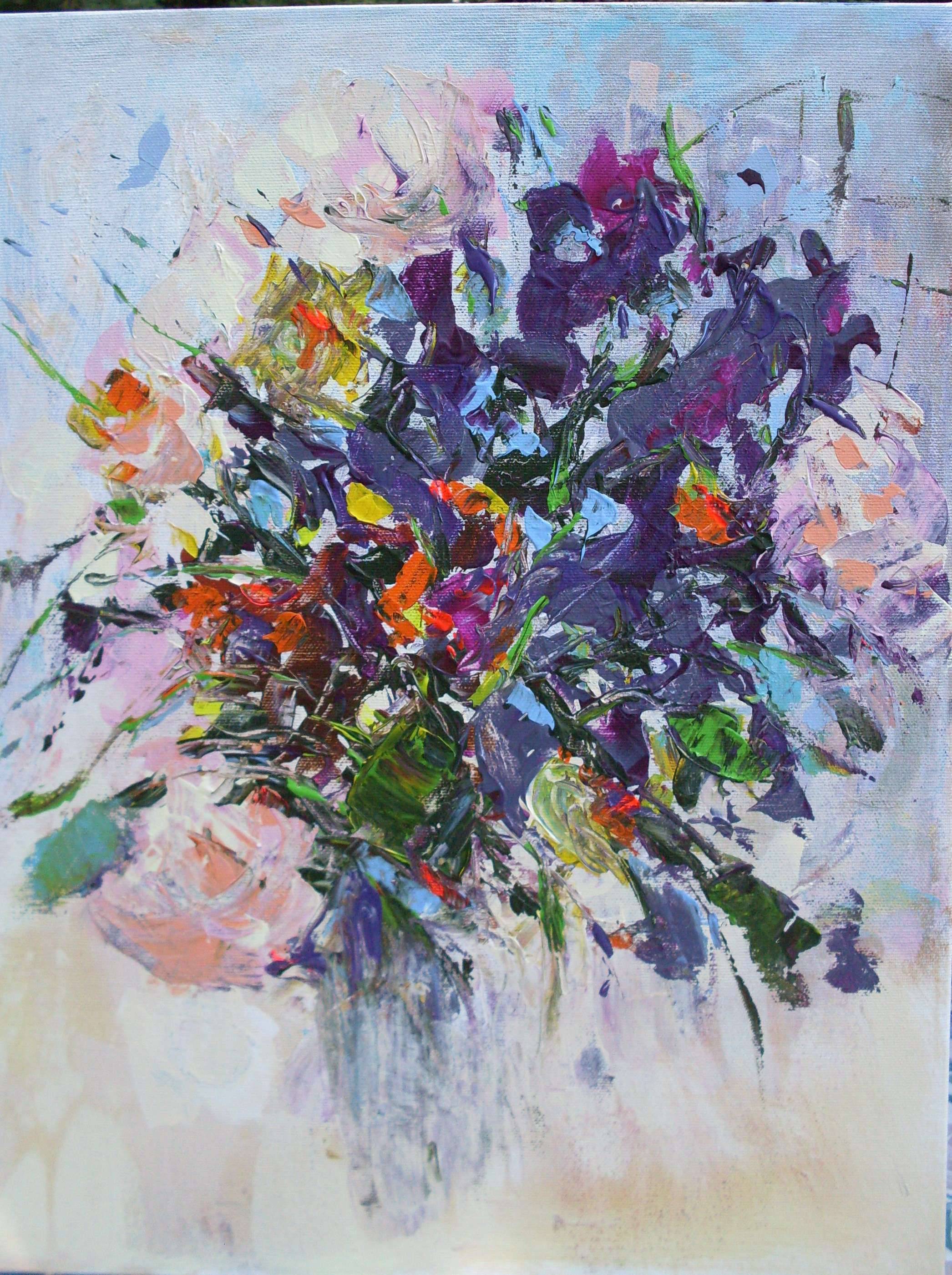 Białe,fioletowe kwiaty,ułożone w bukiet,uchwycone w jasnym ,rozproszonym świetle.Obraz ekspresyjny,malowany szpachelką, swobodną ręką,farbami akrylowymi na płótnie.