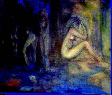 Obraz, który widzimy, emanuje tajemniczością i głębią. Dominują na nim ciemne, nasycone kolory: intensywne odcienie niebieskiego przeplatają się z delikatnymi akcentami ciepłych barw, takich jak żółć i czerwień. Postać na pierwszym planie, niemal schowana w cieniu, przyciąga wzrok swoją niecodzienną pozycją. Kompozycja obrazu jest dynamiczna, pełna zakamarków i niezbadanych przestrzeni, które wciągają obserwatora. Atmosfera jest melancholijna, niemal przygnębiająca, ale są takie momenty, kiedy pojawia się iskierka nadziei. Wydaje się, że artysta zastosował technikę impastu, gdzie faktura farby i sposób nakładania nadają dziełu głęboki, trójwymiarowy charakter. Wpatrując się w to dzieło, można odczuć pogodzenie ze smutkiem, a jednocześnie zainteresowanie. Czy to obraz o samotności? Może. Ale również o poszukiwaniu. Myślę, że każdy, kto na niego patrzy, może odkryć w nim coś innego. To też mogłoby być "scary" in some way, ale przecież każdy strach niesie ze sobą cień fascynacji. Gdyby spojrzało na niego dziecko, mogłoby chyba powiedzieć: "To wygląda jak smutne duchy". Te duchy kryją jakieś tajemnice, czekają, aż ktoś je odkryje. Czuć w tym bliskość jakby znaną, ale wciąż nieuchwytną. Obraz zmusza do przystanięcia, zastanowienia się nad sobą i własnymi emocjami.jeniami.