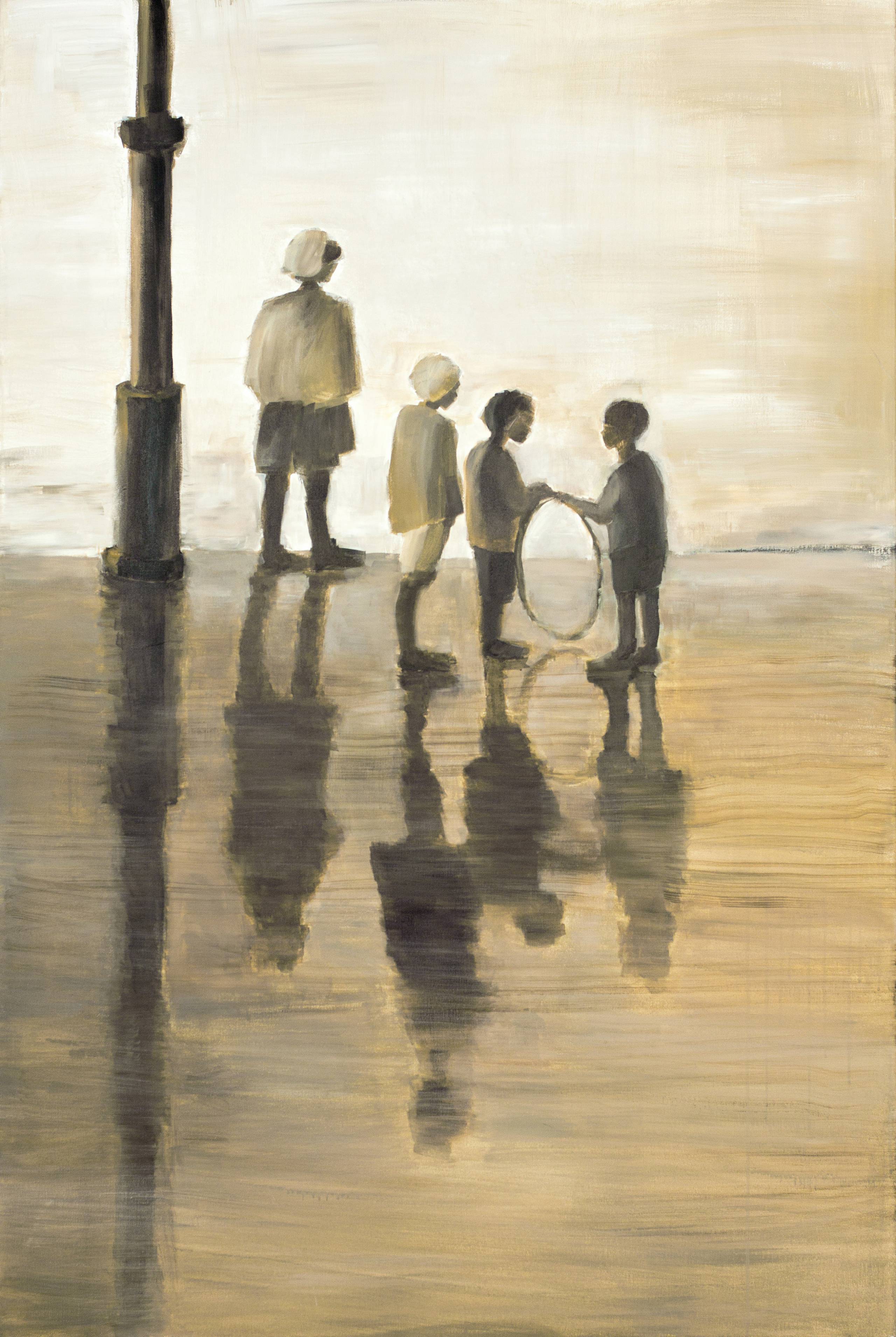 Obraz przedstawia czwórkę dzieci, stojących na mokrym bruku, odbijającym delikatne światło. Tło jest utrzymane w subtelnych odcieniach beżu i szarości, co nadaje kompozycji spokoju i nostalgii. Poszczególne sylwetki są ledwo zarysowane, niemal jakby były wspomnieniem z odległej przeszłości. W centralnej części obrazu dwójka dzieci trzyma hula hop, a światło wydobywa ich cienie na mokrej powierzchni. "Wow, oni się bawią w kaloszach!" powiedziałoby moje dziecko. Klimat emanuje ciszą, jakbyśmy przenieśli się do chłodnego, mgielnego poranka. Artysta zastosował technikę, która nadaje obrazowi efekt rozmycia. Może być tu widoczny wpływ impresjonizmu, gdzie prym wiodą emocje i ulotne chwile. Ten obraz jest dość niezwykłe, like a dream. Na pierwszy rzut oka widzimy prosty moment z codziennego życia, ale przy bliższym spojrzeniu, całość wydaje się być metaforą dzieciństwa - efemerycznego, niespokojnego, ale pełnego niewinności i beztroski. Wzbudza to we mnie uczucie tęsknoty za prostym czasem, kiedy jedynym zmartwieniem było to, jak daleko uda się zakręcić hula hop.