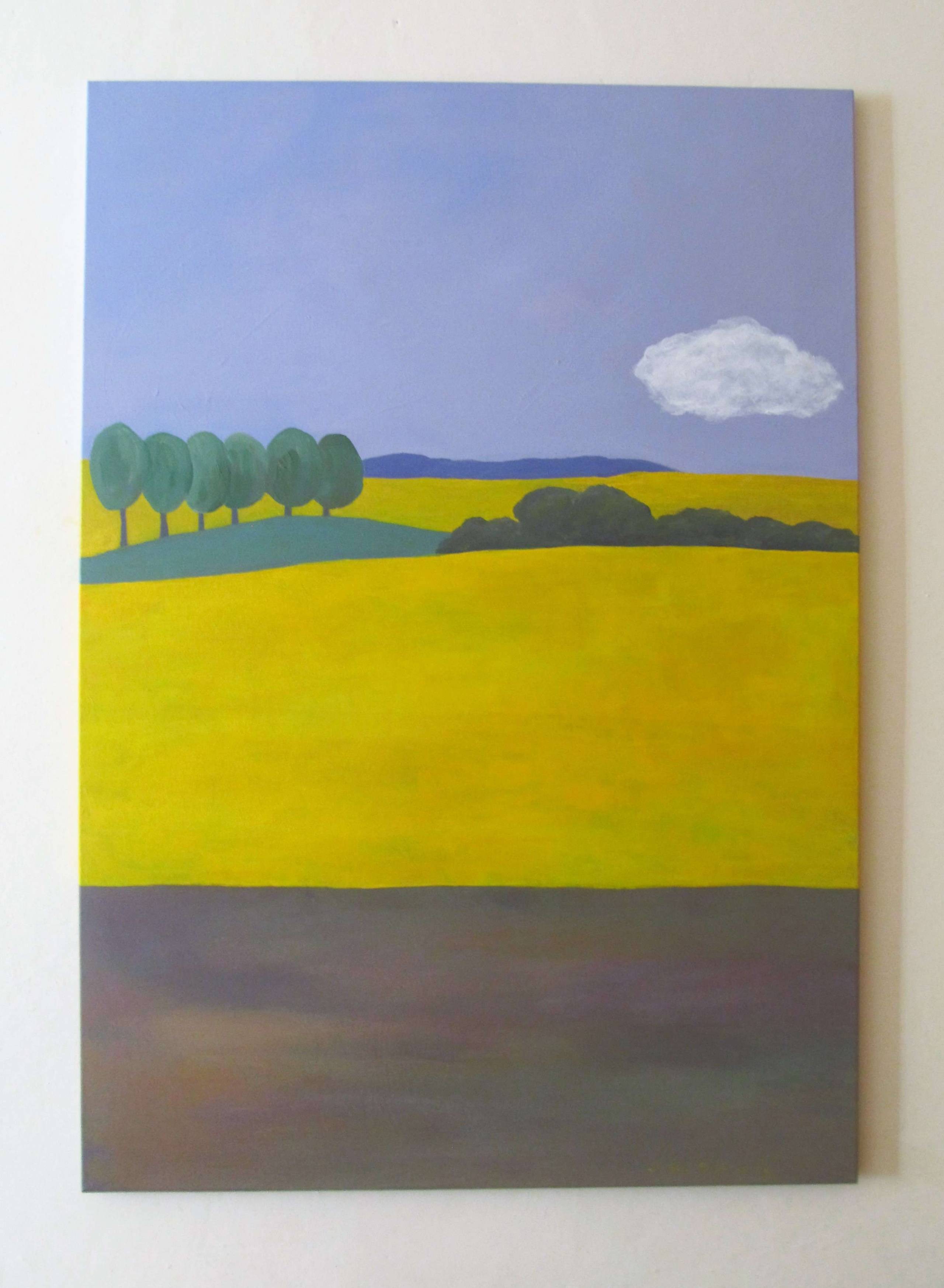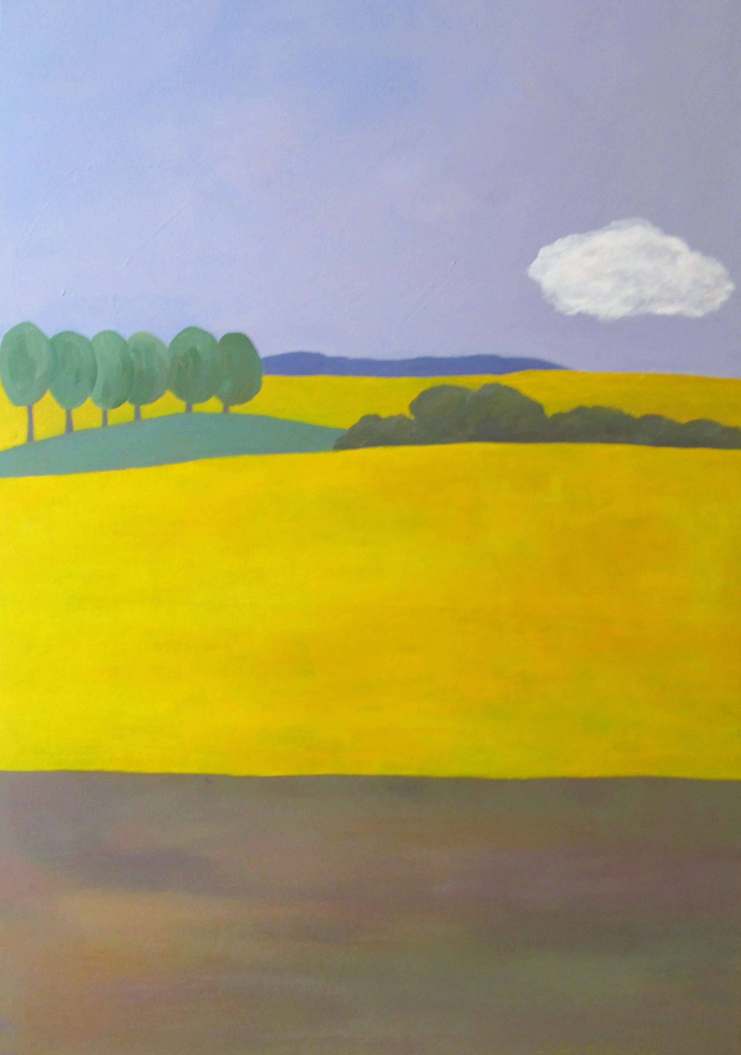 Swojski pejzaż przedstawiam w sposób uproszczony, by żółte pola dominowały pod błękitno-szarym niebem.