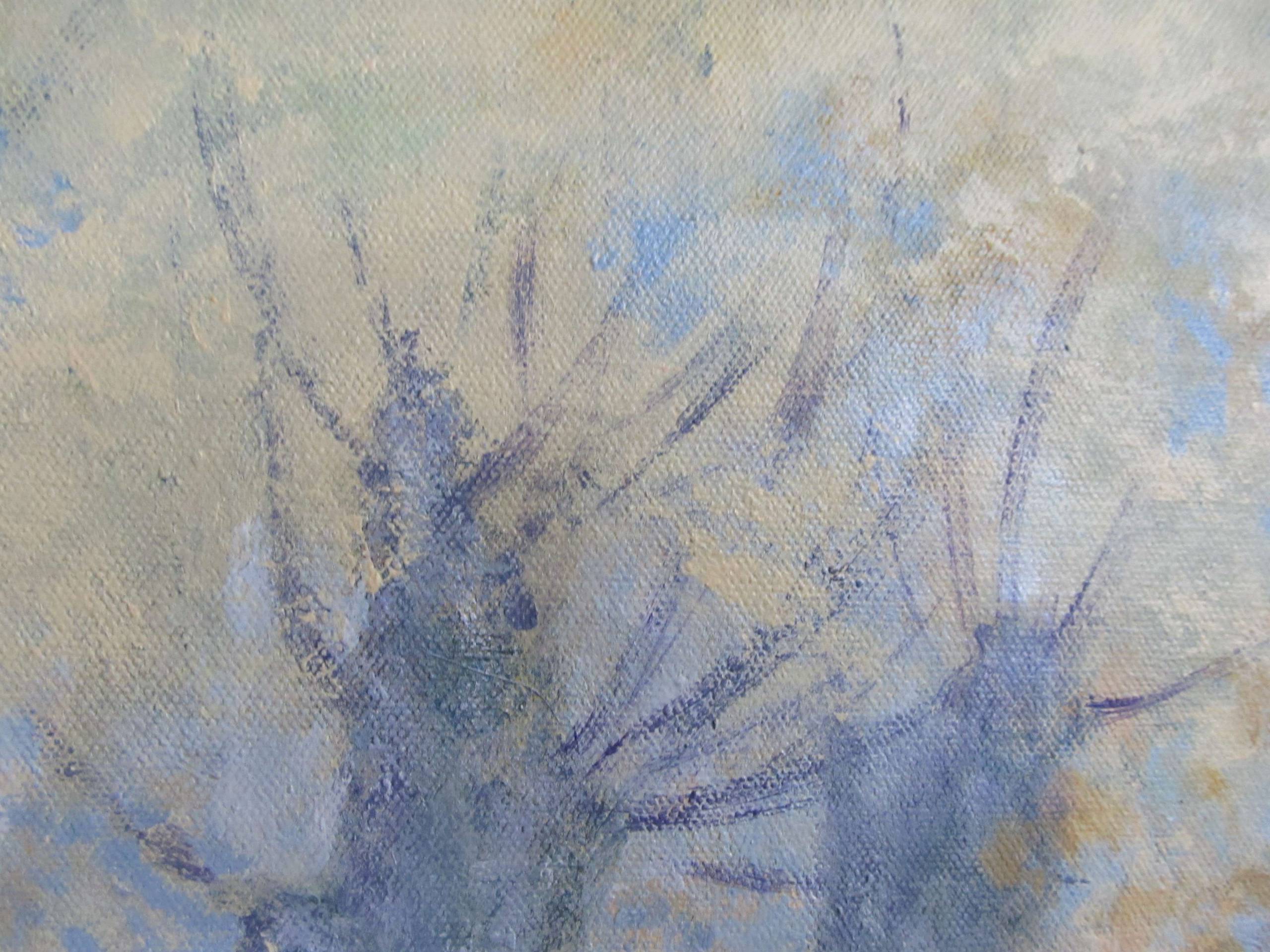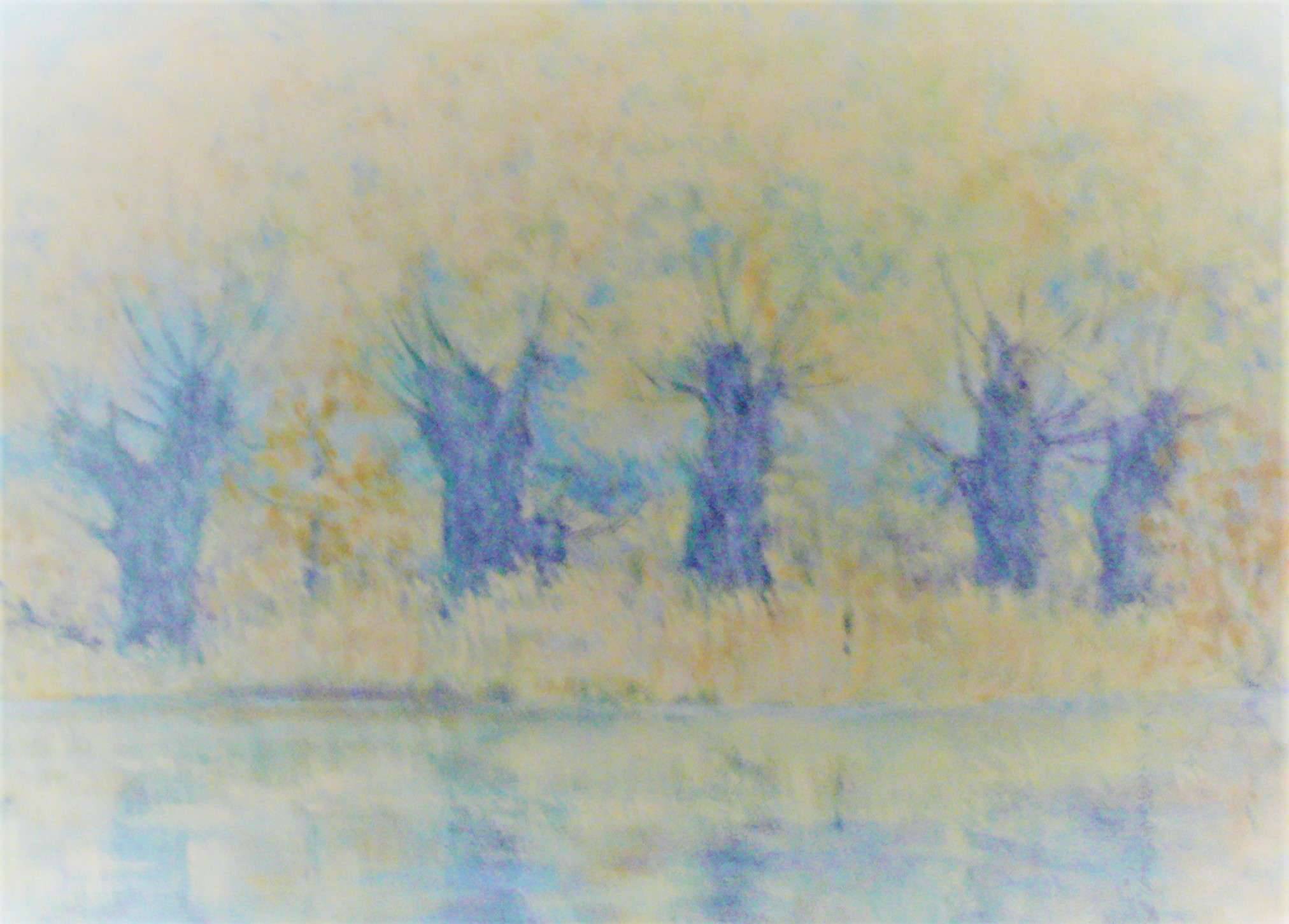 Obraz o delikatnej kolorystyce żółtości, beżu i błękitu podkreślonych szarością pni wierzbowych to charakterystyczny widok dla jesieni na Żuławach.