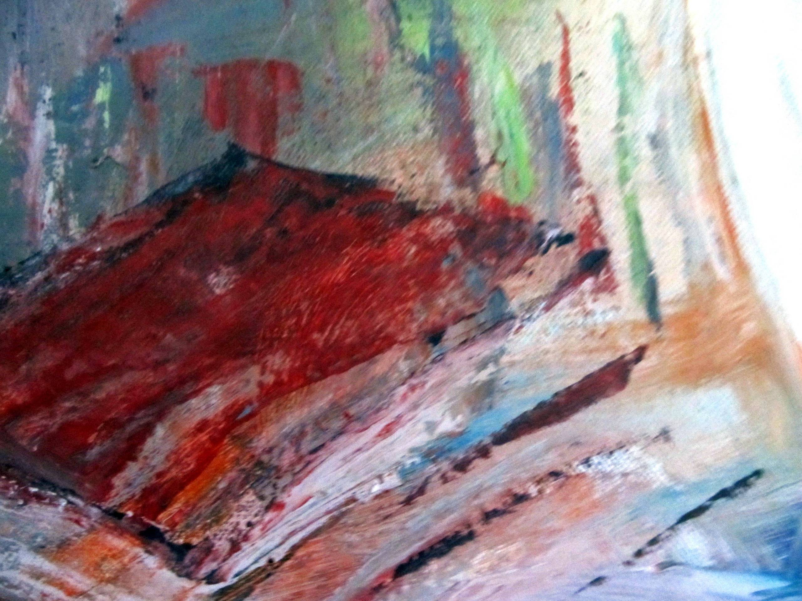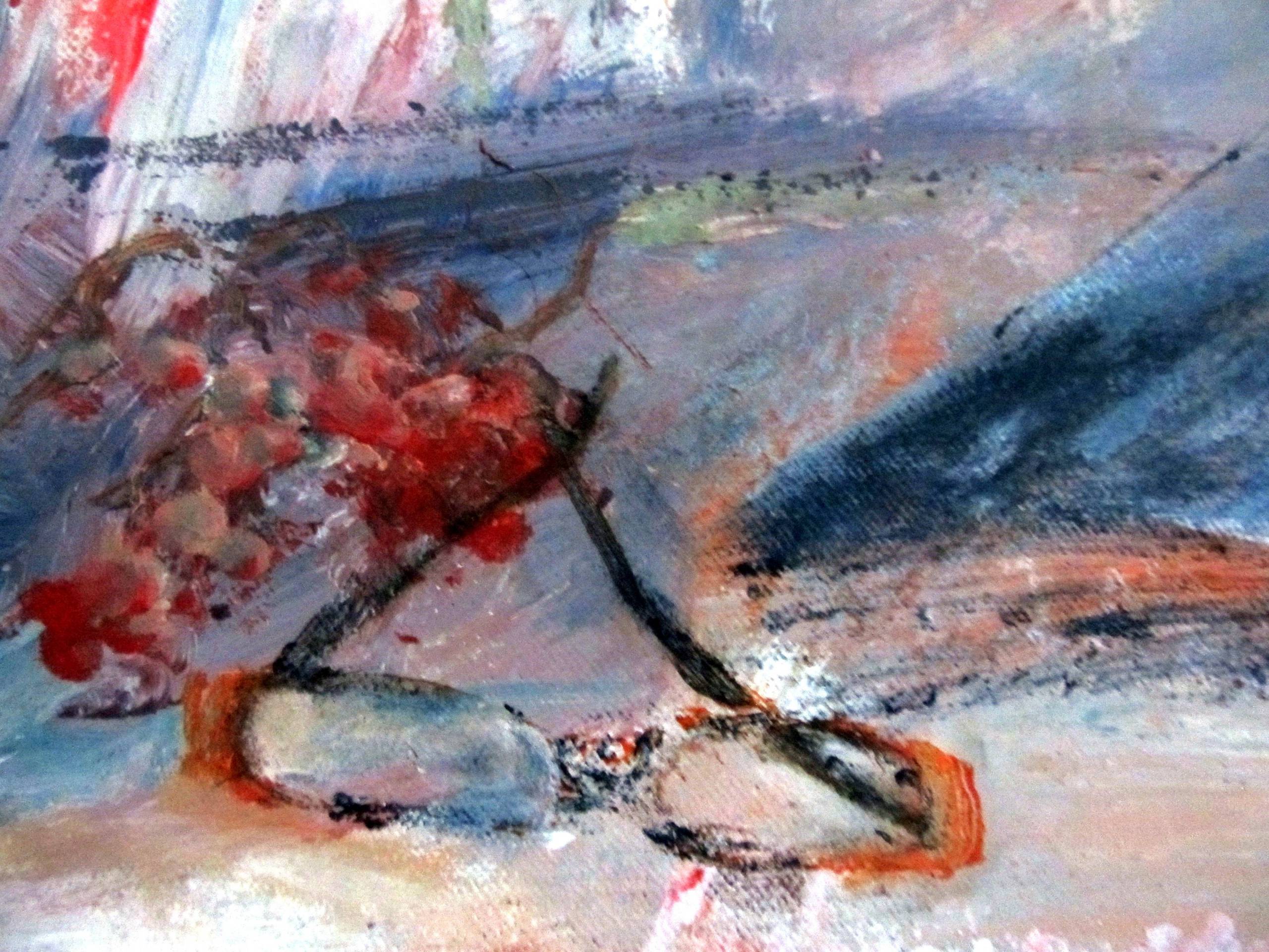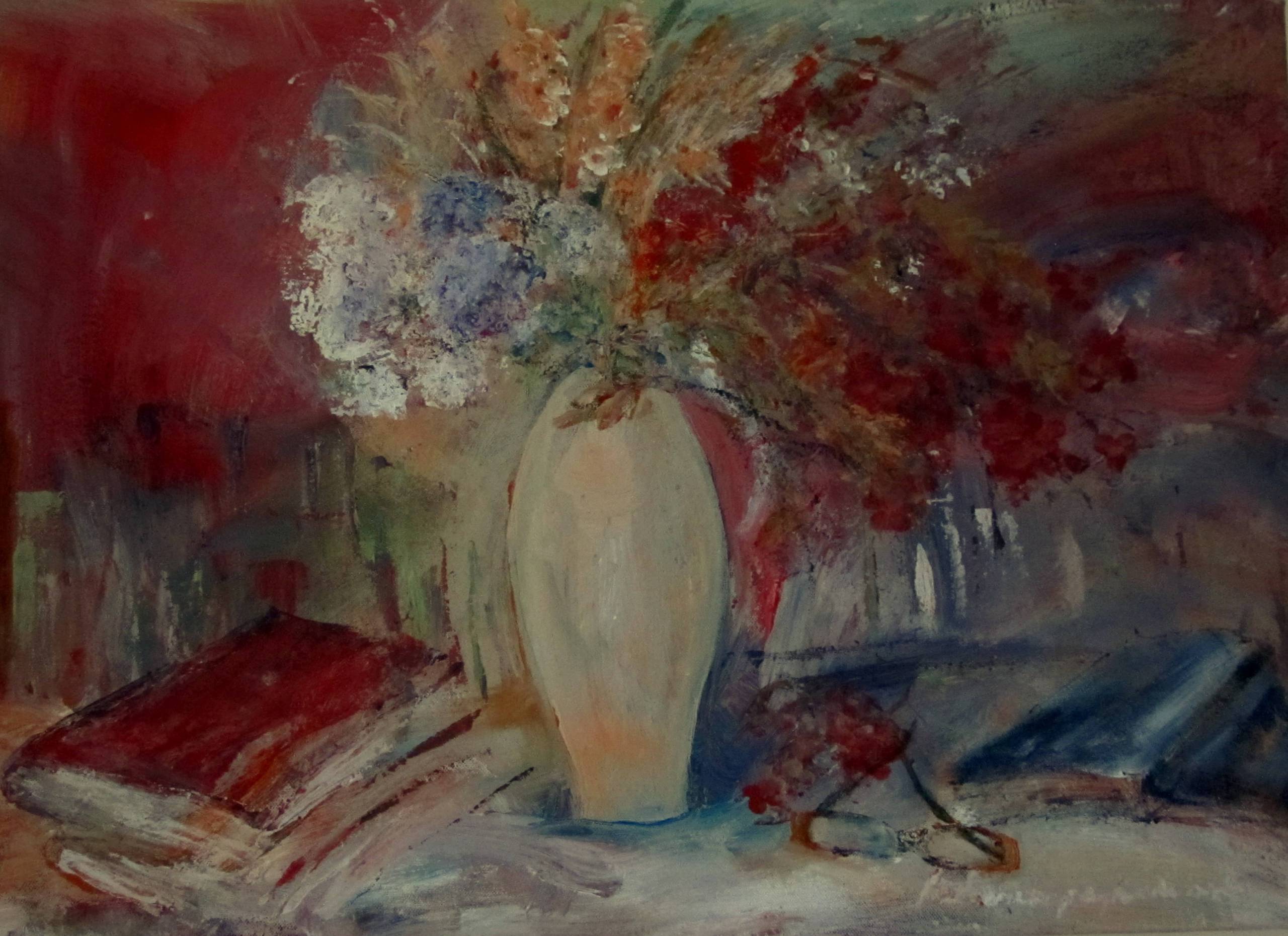Martwa natura dotyczy codzienności i najbliższego otoczenia Chwila zapisana została alla prima. W obrazie dużo jest beżu i czerwieni.