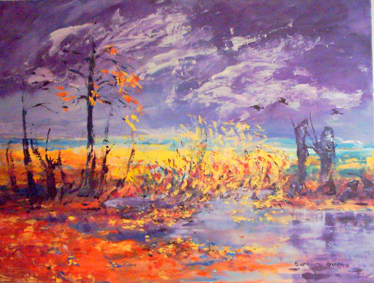 Swobodnie malowany, dynamiczny obraz ze specyficzną atmosferą, wynikającą ze zderzenia ciepłych kolorów z zimnymi fioletami i błękitami.