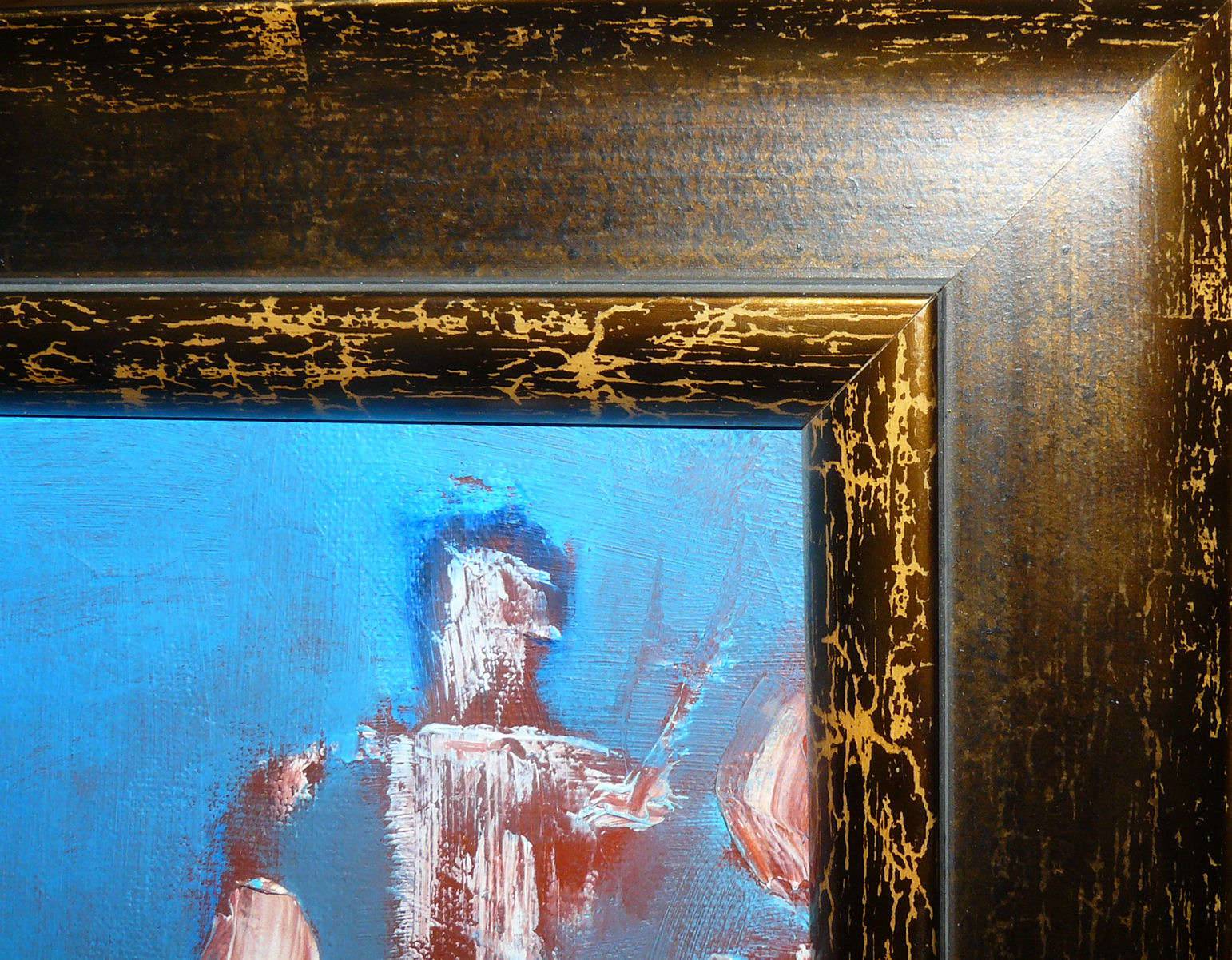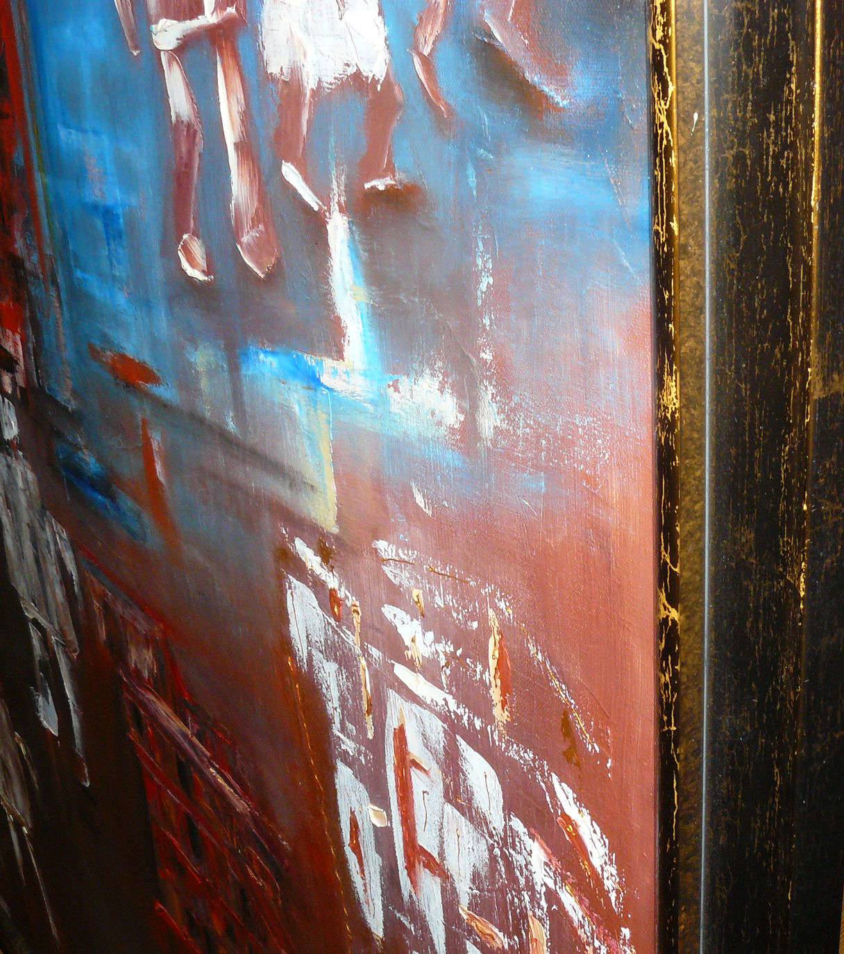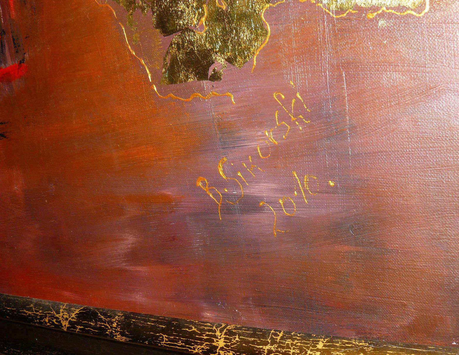 Obraz malowany w technice olejnej z elementami szlagmetalu/platki zlota/.Posiada zamalowane boki. Obraz oprawiony w drewnianą ramę. Wymiary:100x100. Sygnowany