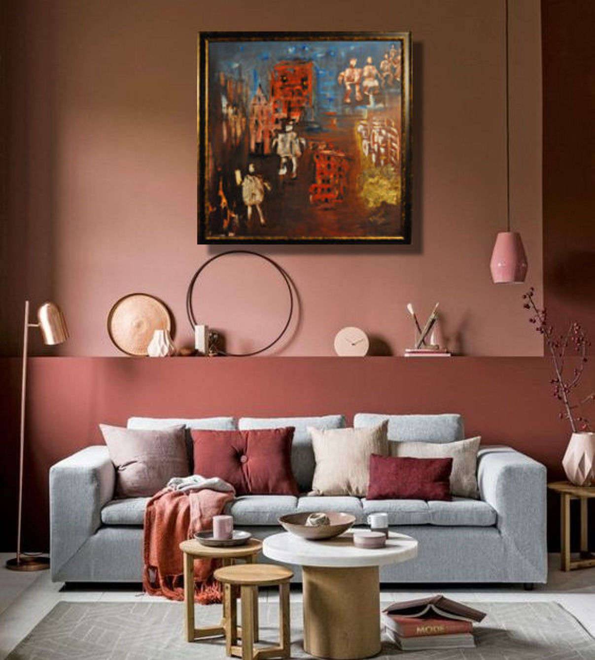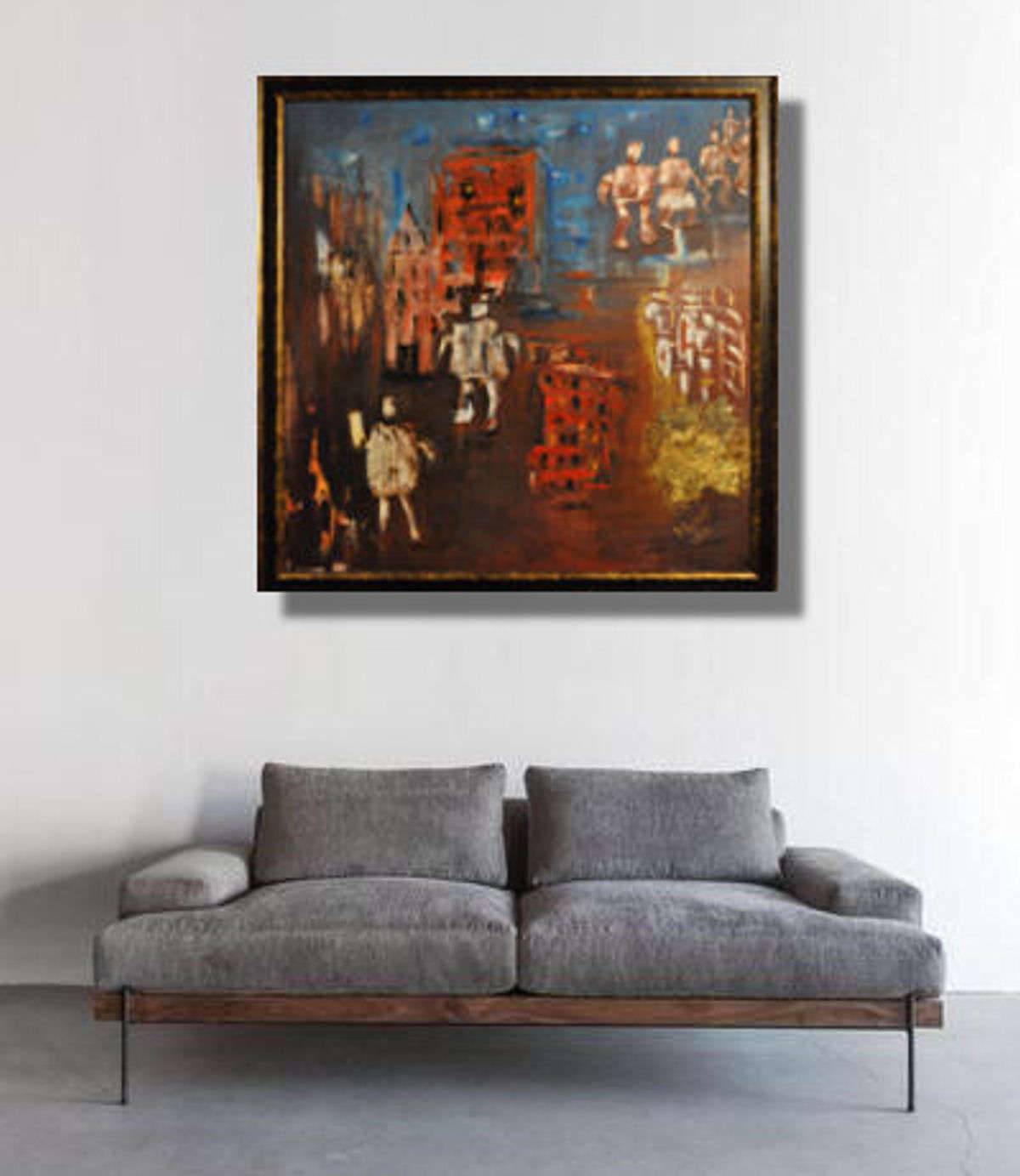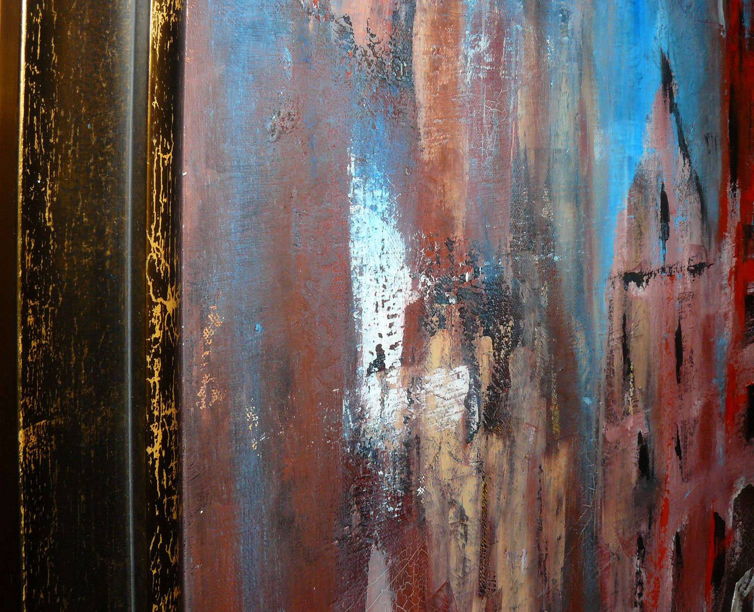 Obraz malowany w technice olejnej z elementami szlagmetalu/platki zlota/.Posiada zamalowane boki. Obraz oprawiony w drewnianą ramę. Wymiary:100x100. Sygnowany