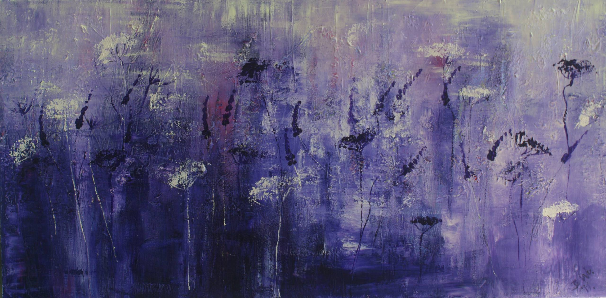 Na obrazie dominują odcienie fioletu i błękitu, które zdają się mieszać w niekończącym się tańcu światła i cienia. Kształty są rozmyte, jakby unosiły się w mglistym, tajemniczym krajobrazie. W tle jaśnieją subtelne akcenty bieli, przypominające delikatne kwiaty na wietrze. Kompozycja wydaje się chaotyczna, ale jest w niej ukryty porządek, który przyciąga wzrok i wciąga do środka. Atmosfera tego dzieła jest pełna spokoju, ale jednocześnie emanuje z niego pewna nutka melancholii. To jakby zarys wspomnień, które próbują się przebić przez mgłę zapomnienia. Styl artysty wskazuje na technikę impasto, gdzie grubo nałożone farby nadają teksturę i głębię każdemu pociągnięciu pędzla. It's magical. Obraz może budzić w odbiorcy różnorodne emocje – od spokojnej kontemplacji po głęboką zadumę nad ulotnością chwili. Czuć tu jakąś tęsknotę, jakby artysta próbował uchwycić ulotną chwilę szczęścia, która jednak wymyka się z rąk. Ten obraz jest naprawdę piękny, jak kropelki fioletowego deszczu na szybie.