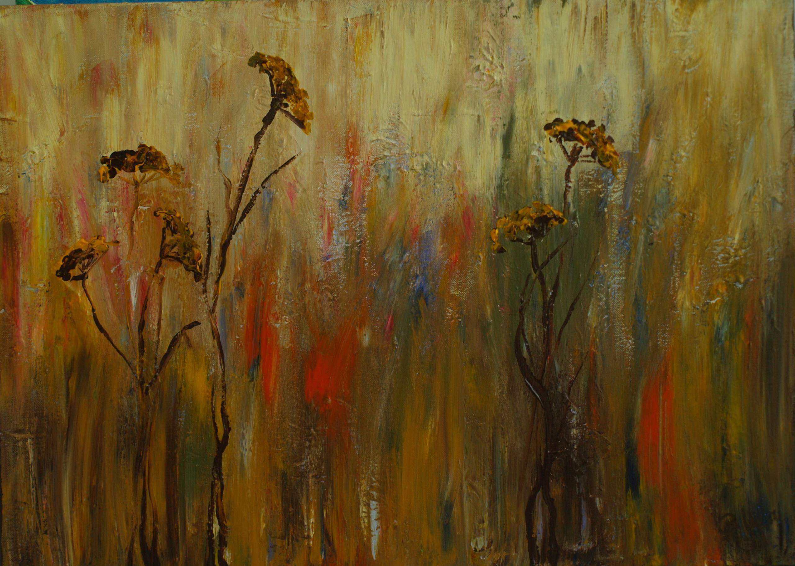 Obraz przedstawia delikatne sylwetki roślin, które wyrastają z mglisto-żółtego tła pełnego rozmytych pasm czerwieni, błękitu i zieleni. Patrząc na ten obraz, czuję się jakbym stał na skraju pola, tuż przed burzą. Kolory są nasycone, ale subtelnie się przenikają, nadając całości niemalże eterycznego charakteru. Jest jakby hidden magic w tym, jak artist operuje farbą – technika impasto sprawia, że struktura obrazu ma swój ciężar. Trudno się nie zatrzymać i nie kontemplować. Atmosfera? To taki cichy, nostalgiczny szept przyrody. Kiedy patrzę na te krucho wyglądające gałązki, myślę o przemijaniu. Pędzle układają się w esy-floresy, które tchną w obraz życie. I nagle czujesz, jakby kolory miały swoje własne opowieści do opowiedzenia. Hej, zobacz – powiedziałby mój 7-letni kuzyn – przecież to wygląda jak w moim śnie. Ten obraz może budzić wiele emocji. Jedni mogą zobaczyć w nim melancholię, inni – nadzieję na nowy początek. To takie płótno, które zmienia się wraz z naszym nastrojem. Kompozycja jest pełna dynamiki, choć na pierwszy rzut oka wydaje się statyczna. To jak tajemnica do odkrycia, niczym książka, której zakończenie zależy od ciebie.