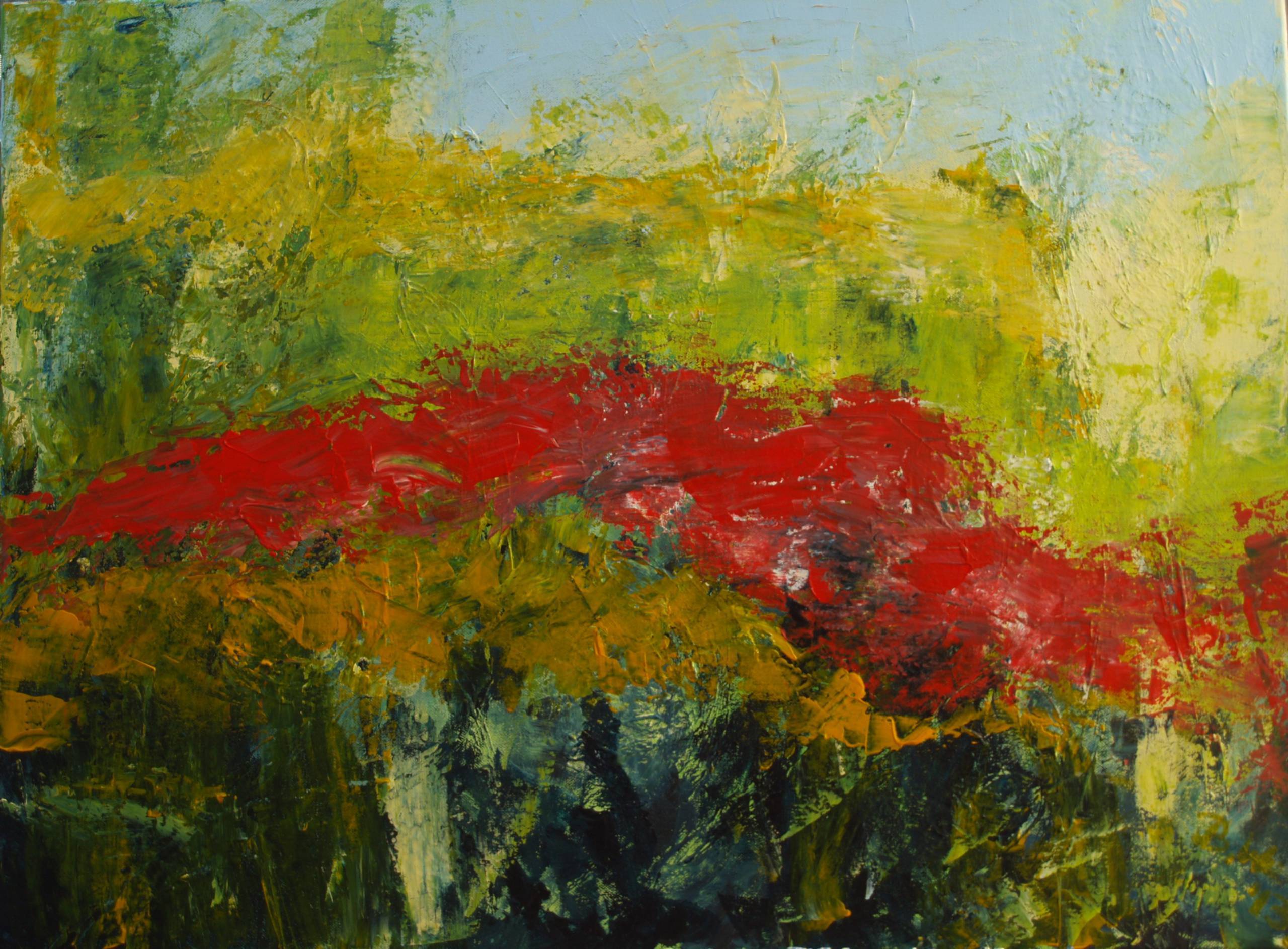 Obraz tętni kolorami i bije od niego energia. Dominują tu żywe odcienie zieleni, żółci, intensywnej czerwieni i błękitu, które splatają się w abstrakcyjną kompozycję. Paleta barw tworzy dynamiczne kontrasty, przyciągając wzrok do środkowej części dzieła, gdzie czerwona wstęga przypomina falującą rzekę. Kształty są nieregularne, spontaniczne, co nadaje pracy wrażenie ruchu i chaosu. Tchnie z niego wiosenna świeżość, jakby natura właśnie budziła się do życia, pełna nadziei i obietnic. Atmosfera obrazu jest radosna, pełna energii i pozytywnych wibracji. Artysta sięgnął po intensywną kolorystykę i dynamiczne pociągnięcia pędzla, które sugerują technikę impastową. Ta technika nadaje obrazowi trójwymiarowości i tekstury, jakby kolory na płótnie niemal fizycznie wylewały się w przestrzeń. Obraz może budzić w odbiorcy różnorodne emocje. U niektórych wywołuje zachwyt i ekscytację, u innych spokój i pogodę ducha. Dla mnie to jak patrzenie przez magiczne okulary na świat pełen nieskończonych możliwości – "wow, mogę wszystko"! Świetnie oddaje ideę freedom, wolności w wyrażaniu siebie. A dziecko mogłoby powiedzieć: "To wygląda jak łąka pełna kwiatków, którą wiatr czesze." Ta praca zachęca do marzeń i twórczej ekspresji, niczym nieskrępowana fantazja. Jest pełna życia, a każdy z nas może w niej zobaczyć coś innego.