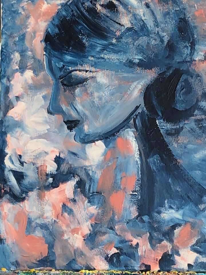 Obraz, który mam przed oczami, jest jak mgiełka tajemnicy, unosząca się w błękicie i łososiowym różu. Przedstawia profil kobiety, jej twarz wyłania się z abstrakcyjnego tła, które zdaje się być w nieustannym ruchu. Kolory przenikają się jak fale na wodzie, tworząc miękkie przejścia i wyraźne kontrasty. Kompozycja wprowadza równowagę, choć jednocześnie jest nieco niestabilna, prowokując ciekawość. Atmosfera obrazka jest melancholijna, przypomina mi długie, ciche popołudnia, kiedy wszystko jest takie ciche. Artysta użył techniki impasto, nakładając farbę grubymi pociągnięciami. To dodaje obrazowi tekstury i głębi, jakbyśmy mogli dotknąć tego wszystkiego. Dla mnie ten obraz to podróż w głąb wspomnień, coś takiego, co wywołuje nostalgię. Może symbolizować spokój albo tęsknotę, zależy od dnia. „Wow, pani wygląda jak chmurka”, powiedziałby mały Jaś. Tak to czuję. Jest w tym coś magicznego, zatrzymującego czas. Osobiście, myślę o angielskim słowie "dreamlike", które idealnie oddaje ten ulotny nastrój. Może to dzieło trafić do serca czytelnika, wprowadzając go w stan zadumy. W prostocie kryje się głębia, a w barwach – emocje.