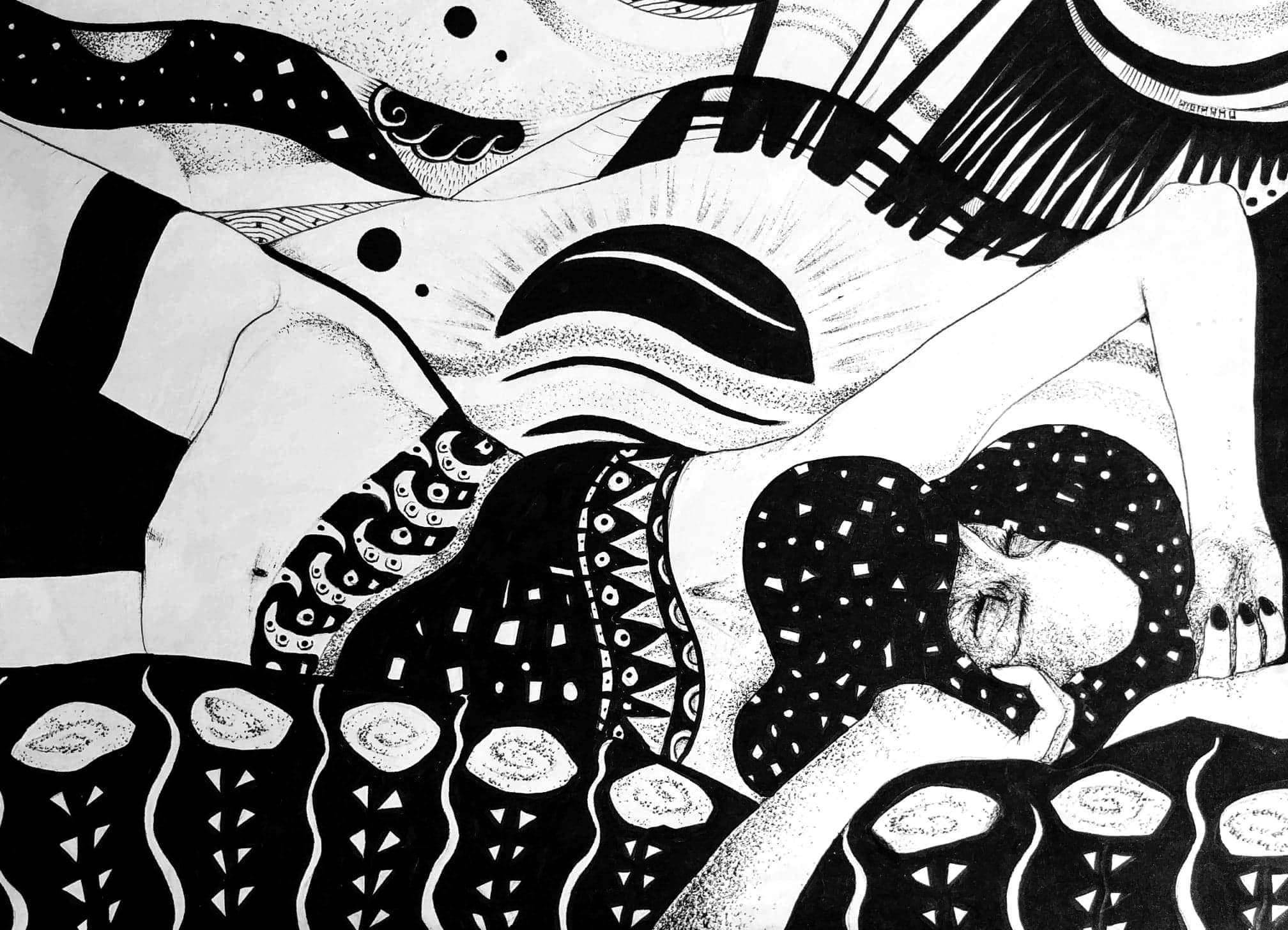 Ten czarno-biały obraz jest prawdziwą eksplozją form i kształtów, przeplatających się w harmonijny taniec. Główną postacią jest figura kobiety, wygodnie zrelaksowana pośród abstrakcyjnych wzorów. Różnorodne, geometryczne kształty wypełniają tło, tworząc dynamiczną kompozycję pełną kontrastów. Czerń i biel, choć proste, wywołują silne emocje i nadają dziełu zawrotną głębię. Całość emanuje spokojem, ale zarazem niepokojącym pozadaniem. Można poczuć, jak artysta, przez swój unikalny styl, zaprasza nas do odkrywania ukrytych znaczeń i emocji. Linie są zdecydowane, a użycie techniki punktowej dodaje całości delikatności. Obraz może budzić w oglądającym uczucie zamyślenia, być może nawet nostalgii. Patrząc na tę kompozycję, myślę sobie: Wow, naprawdę ciekawie to wygląda! Tu i ówdzie, małe wzory układają się w coś, co przypomina dziecięce rysunki, pełne niewymuszonej lekkości. A little bit of magic, jakby dzieło przenosiło nas do innego wymiaru, pełnego sennych marzeń i inwencji.