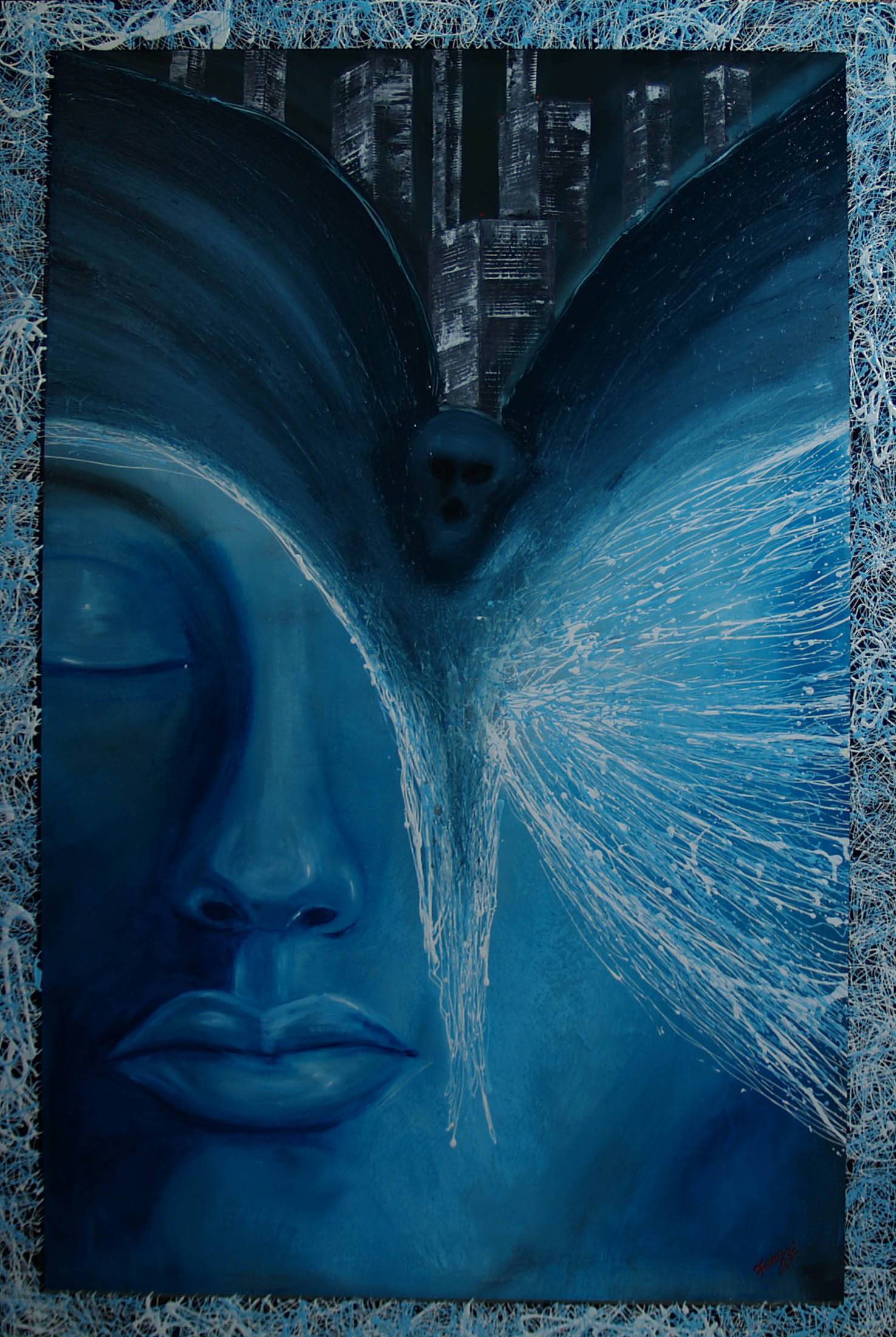 W centrum obrazu dominuje intensywna błękitna twarz, delikatnie zarysowana, z zamkniętymi oczami. Jej kontury wydają się zataczać kręgi w niekończącej się przestrzeni. Tło jest pełne błękitnych tonów, które przechodzą w mroczny granat. Kompozycja jest symetryczna, co nadaje całości harmonii, mimo że w tle majaczy nieco niepokojąca czaszka. Widoczne budynki w tle, jakby unoszące się nad całą sceną, dodają obrazowi miejskiego charakteru, sugerując relacje między człowiekiem a nowoczesnym światem. Nastrój jest surrealistyczny, trochę jak dreamscape, a mimo to emanuje spokojem. Artysta zastosował technikę łączenia pociągnięć pędzla i techniki chlapania farbą, tworząc efekt przypominający pajęczą sieć wokół centralnej postaci. Całość wywołuje wrażenie ulotności i tajemnicy. Moim zdaniem obraz skłania do refleksji nad połączeniem duszy z zewnętrznym światem, co może budzić uczucie introspekcji lub nawet melancholii. Obrazie zdaje się szeptać o kruchości egzystencji, a jednocześnie o jej pięknie, wciągając widza w osobistą podróż po emocjach. Jedenastoletni Jaś mógłby powiedzieć: "To wygląda jak magiczny sen". Mroczny klimat, lecz niepozbawiony nadziei, urzeka i przyciąga wzrok, niczym tajemnicze butterfly in a dream.