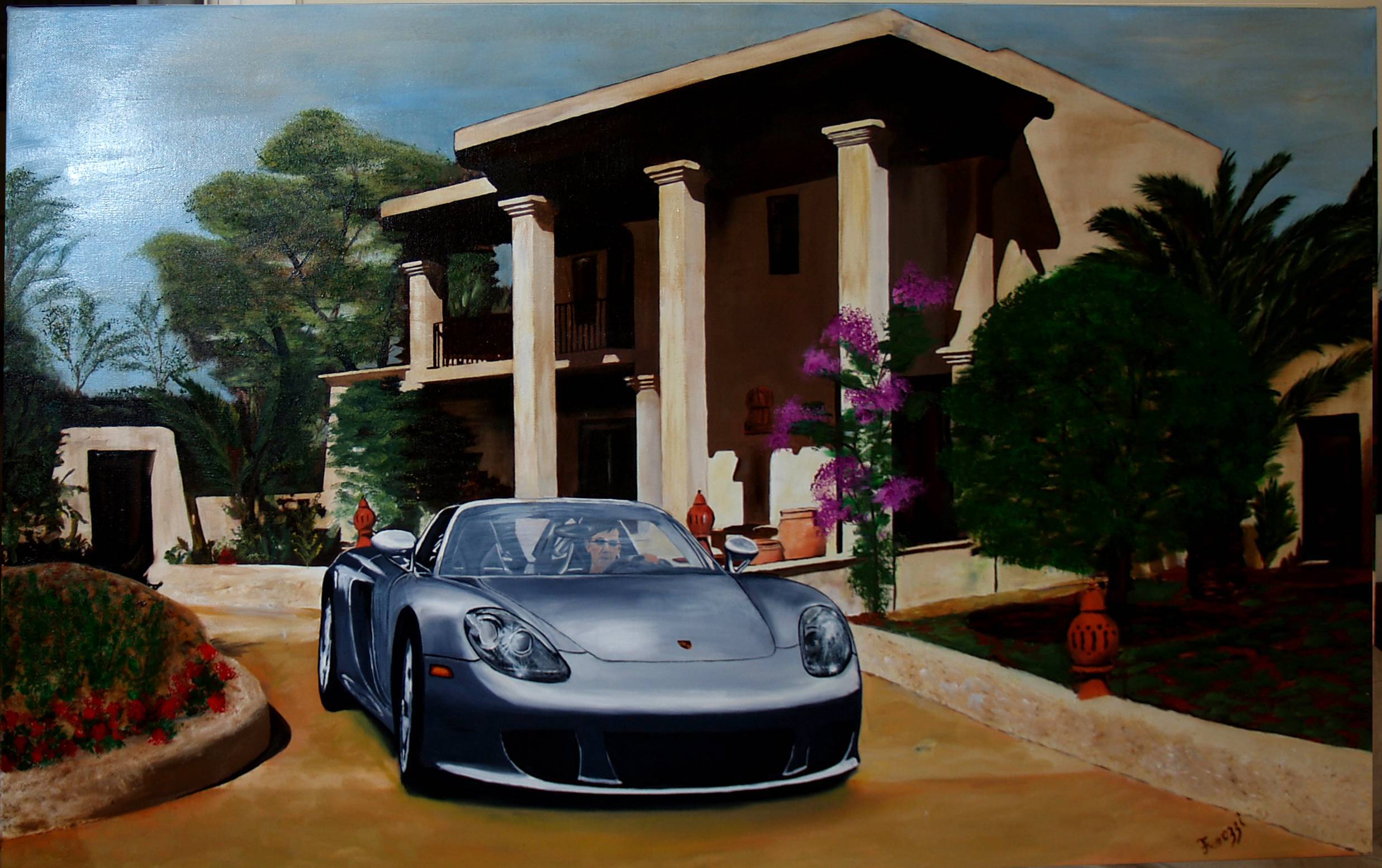 Obraz przedstawia luksusową willę otoczoną bujną zielenią. Na pierwszym planie dumnie prezentuje się srebrny samochód sportowy, którego błyszczące karoseria odbija światło. Fasada budynku utrzymana jest w jasnej tonacji, z odcieniami beżu i brązu. Wokół widać piękne kwiaty, w tym intensywnie fioletowe krzewy, które dodają życia całej scenie. Całość emanuje spokojem i luksusem. Można poczuć letni powiew wiatru i wyobrazić sobie cichy szum pobliskich drzew. Atmosfera na obrazie jest pogodna i relaksacyjna, jakby czas miał się zatrzymać na chwilę. Styl artysty jest realistyczny, z dbałością o detale. Technika malarska uwydatnia grę światła i cieni. Samochód wygląda prawie jak żywy, jego linie są doskonale oddane, a kolorystyka harmonijnie komponuje się z resztą krajobrazu. Patrząc na obraz, czuje się marzenia o luksusowych podróżach, o świecie bez pośpiechu i trosk. Właśnie tutaj można poczuć, że wszystko jest możliwe. Taki widok to "pure escapism". Dla dziecka może to być miejsce, gdzie mieszka superbohater z błyszczącym autem. Obraz wywołuje we mnie lekką nutkę zazdrości i tęsknoty za spokojem. To miejsce, które każdy chciałby kiedyś odwiedzić i na chwilę zapomnieć o rzeczywistości.