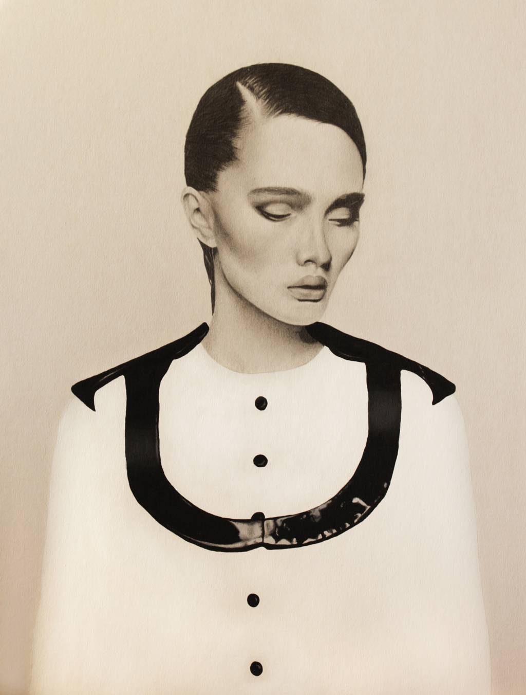 Na obrazie widzimy minimalistyczny portret kobiety, utrzymany w czerni i bieli, co nadaje dziełu nowoczesny i elegancki charakter. Twarz jest smukła, z zamkniętymi oczami, otoczona gładką, ciemną fryzurą. Strój, przypominający kapłańską sutannę, zdobią duże guziki i kontrastuje z jasnym tłem, tworząc harmoniczną kompozycję. Artysta użył delikatnych przejść tonalnych i precyzyjnej kreski, co nadaje rysunkowi subtelną, lecz wyrazistą formę. Obraz emanuje spokojem i introspekcją. Czyżby kobieta pogrążała się w głębokiej zadumie? Jej neutralna ekspresja twarzy pobudza wyobraźnię, skłaniając do refleksji nad emocjami skrywanymi wewnątrz. Klimat dzieła jest nieco tajemniczy, a zarazem comforting, jak ciche popołudnie spędzone na lekturze ulubionej książki. Styl artystyczny jest typowy dla realizmu z domieszką minimalizmu. Rysowane linie są precyzyjne, ale nie przesadnie drobiazgowe. Technika wydaje się łączyć grafit z tuszem, co dodaje pracom głębi i kontrastu. Odbiorca może poczuć się zaintrygowany, zastanawiając się nad historią postaci. Mógłbym rzec, że obraz przypomina ciszę przed burzą, gdzie spokój to tylko powierzchnia dla kipiących emocji. Może siedmiolatek mógłby powiedzieć: „Ta pani wygląda, jakby myślała o czymś miłym”. Każdy widz może odkryć w obrazie coś unikalnego, coś własnego. To piękno sztuki – zawsze pozostaje trochę niewypowiedziane, pozwalając odbiorcy dopisać własny rozdział.