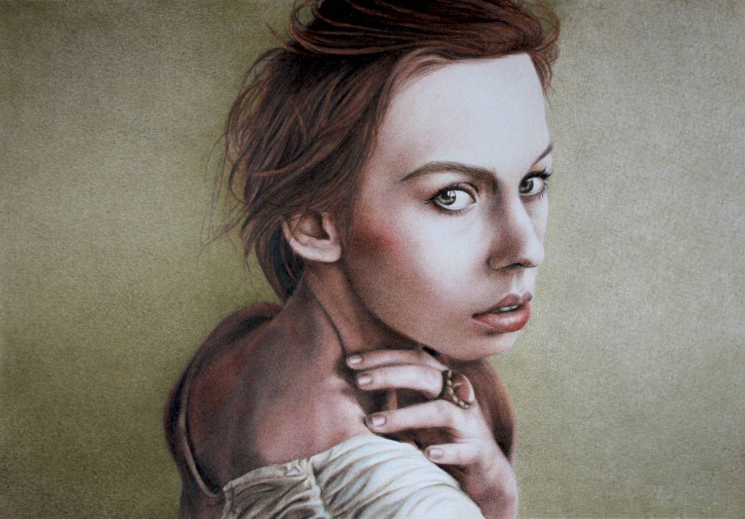 Na obrazie widzimy portret młodej kobiety o intensywnym spojrzeniu, w delikatnych, przygaszonych kolorach. Dominują odcienie ziemi i subtelna zieleń tła, które zdają się pochłaniać figuralny kształt postaci, podkreślając jej dominującą obecność. Kompozycja skupia się na twarzy, która prawie magnetycznie przyciąga wzrok. Jej włosy lekko rozczochrane, jakby delikatny wiatr je przeczesał, dodają pewnej nieuchwytnosci scenie. Atmosfera emanuje spokojem, ale zarazem czymś tajemniczym–to tak, jakbyśmy patrzyli na kogoś, kto skrywa głęboko ukryte troski. Wygląda trochę, jakby myślała, czy coś zjadła czy nie. Artystycznie, obraz przypomina styl realistyczny z subtelnym użyciem pastelowych technik, które dają miękki, niemal eteryczny wygląd. Czuję, że ten portret wywołuje ambiwalentne emocje: fascynację i lekki niepokój. A te oczy. Ooczy są jak "windows" do duszy. Może to przypominać odbiorcy własne refleksje nad ulotnymi chwilami życia. Zastanawiam się, co artysta myślał, tworząc ten obraz. To dzieło każe nam zastanowić się nad tym, co jest poza powierzchnią widzialnego. Może to był ktoś, kogo znał? Może ktoś, kto stał się tylko wspomnieniem, ukrytym w kolorach i formach tego portretu.
