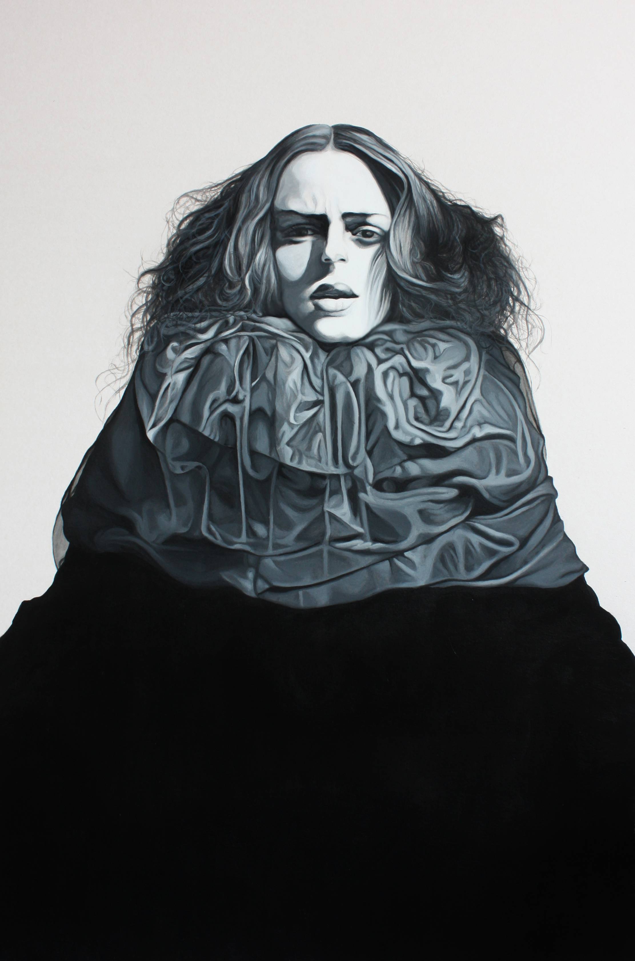 Na obrazie widzimy intrygującą scenę, gdzie centralną postacią jest kobieta spowita w ciemne, niemal gotyckie szaty. Kolory to głównie monochromatyczne odcienie czerni i szarości, które podkreślają dramatyzm i tajemniczość. Jej twarz jest wyraźnie zarysowana, z ekspresją niedopowiedzenia. Włosy, przypominające pierzaste fale, dodają dynamiki. Kompozycja jest minimalistyczna, co skupia uwagę na emocjach postaci. Atmosfera obrazu jest ponura i zawiesista jak mgła o poranku. Czuje się tu lekką grozę, ale też pewną elegancję. Artysta używa techniki realistycznej, niemal fotograficznej precyzji, co sprawia że postać prawie ożywa przed oczami widza. Każdy, kto spojrzy na ten obraz, może poczuć dreszcz, a może nawet nutkę fascynacji. Interpretacje mogą być różne. Dla jednych to może być symbol samotności, dla innych wyraz poszukiwania tożsamości. A może to trochę szalona królowa z bajki. Styl obrazu jest intrygujący, a technika oddaje fenomenalnie detal i strukturę materiału. Wow, this is deep – chciałoby się powiedzieć. Obraz zdecydowanie skłania do refleksji nad naszymi wewnętrznymi emocjami i lękami.