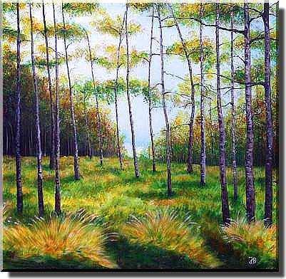 Obraz przedstawia malowniczy las, gdzie kolor zieleni przenika się z delikatnymi odcieniami żółci i brązu. Drzewa stoją smukło, jak eleganccy strażnicy, a ich pnie tworzą pionowe linie, które dodają kompozycji głębi i spokoju. W oddali delikatnie migocze błękit nieba. To tak, jakbyśmy patrzyli przez otwarte okno na świat pełen harmonii. Atmosfera obrazu jest wręcz magiczna, jakby czas tu zwolnił. Ręka artysty z niezrównaną precyzją posługuje się elementami techniki impasto, nadając tekstury liściom i trawie. Emocje jakie obraz może wzbudzić to nostalgia, tęsknota za utraconym rajem dzieciństwa. Wow, to jest takie piękne miejsce. Patrząc na to dzieło, można poczuć zapach lasu i usłyszeć delikatny szum liści - "peaceful" jak to mówią. Krajobraz zdaje się szeptać dawne opowieści. Obraz może być medytacją nad pięknem natury, ucieczką od codzienności. Z każdym spojrzeniem widzimy, jak artysta pragnie uchwycić nieokiełznaną wolność przyrody.