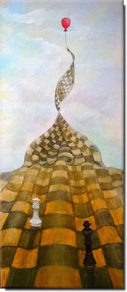 W obrazie dominuje wyrazista gama kolorów. Żółto-brązowa szachownica delikatnie faluje ku horyzontowi, a czerwony balonik unosi się w kierunku nieba. Całość zdaje się ożywać, jakby tkanie rzeczywistości właśnie ulegało transformacji. Artysta zastosował surrealizm, łącząc elementy zbyt niezwykłe dla codziennego świata. Atmosfera nasycona jest marzycielskim nastrojem, tajemniczością, trochę jak w magicznym śnie. Obraz emanuje spokojem, ale jednocześnie budzi ciekawość, prowokuje do zatrzymania się na chwilę. Czarny i biały pionek szachowy to jak symbol konfrontacji, kontra w delikatności krajobrazu. "Look, jakbym leciał balonem!" mogłoby powiedzieć dziecko. Obcowanie z tym dziełem daje poczucie ucieczki od rzeczywistości. Fala emocji, od dziecięcej radości po głęboką refleksję, miesza się z delikatnością paletowych przejść. To zachęta do poszukiwania wolności w codziennej rutynie.