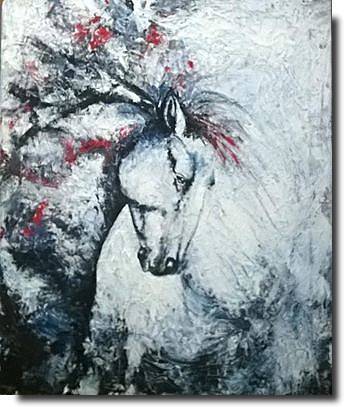 Na obrazie widzimy konia w zaskakującej palecie kolorów. Dominują biel, czerń i odcienie szarości, z akcentami czerwonych plam, które dodają dynamizmu i pewnej tajemnicy. Forma konia jest lekko rozmyta, co dodaje dziełu impresjonistycznego charakteru. Tło zdaje się być w ruchu, jakby wiatr targał gałęziami drzew lub deszcz bębnił o ziemię. A może to tylko nasze wyobrażenie. Atmosfera jest trochę melancholijna, ale i magiczna. Taki "fairytale vibe", który przypomina o dawnych opowieściach z dzieciństwa. Artysta użył szerokich, energicznych pociągnięć pędzla, co nadaje obrazowi ekspresję i siłę. W niektórych miejscach pojawiają się grubsze warstwy farby, tworząc efekt prawie trójwymiarowy. Oglądając tę pracę, można poczuć zarówno spokój, jak i lekki niepokój. To jak spacer nocą przez las. Dla mnie obraz ten emanuje siłą natury i wolnością. Moja siostra mówi, że koń wygląda, jakby mu się śniło coś pięknego. Jakby był gdzieś daleko, choć tutaj, na płótnie, jest taki obecny. Naprawdę można się w nim zatracić. To takie zwykłe, a jednocześnie niecodzienne dzieło, które na pewno zostaje w pamięci na dłużej.