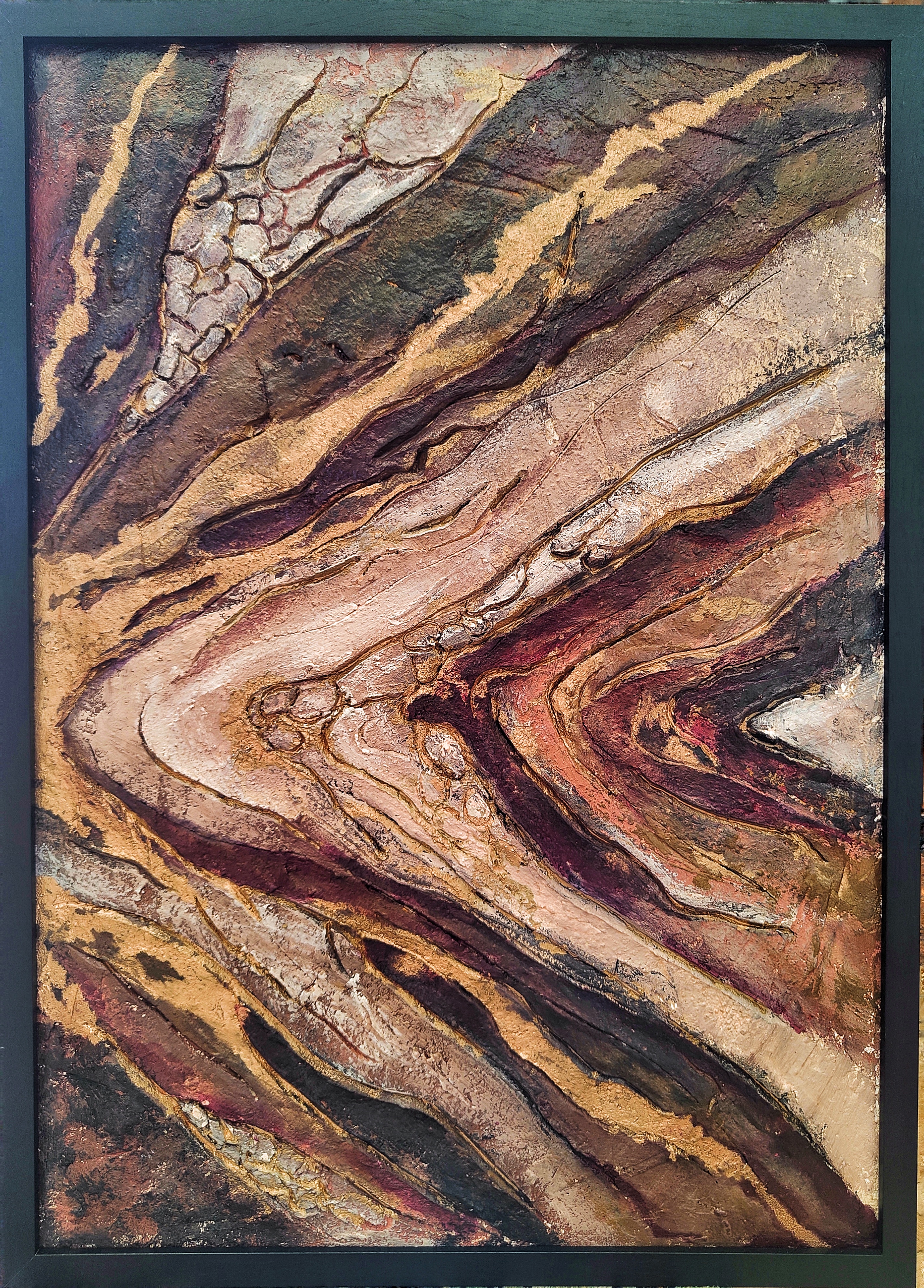 Praca inspirowana naturą w oryginalnej technice. Przedstawia słoje drewna. Gęsta faktura, różne rodzaje farb i lakierów tworzą niepowtarzalne dzieło. Obraz oprawiony w czarną drewnianą ramę.
