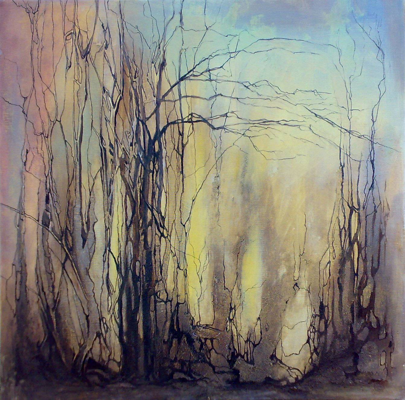 Na obrazie dominuje delikatna paleta pastelowych barw: miękkie beże, subtelne szarości i nuty złocistego żółtego tworzą idealną harmonię. W centrum kompozycji wychodzą smukłe gałęzie przypominające fantazyjne zarysowane linie. Czuć w tym dziele pewną airy lekkość. Gałązki jakby tańczą na wietrze, delikatnie flirtując z wyobraźnią widza. Atmosfera jest tajemnicza, pełna niedopowiedzeń. Może trochę nostalgii, trochę zadumy. Artysta użył techniki przypominającej akwarelę, choć z domieszką akryli, co daje wyjątkowy efekt tonalny. Powierzchnia obrazu zdaje się niemal oddychać. Mieszanka abstrakcji z nutą realistycznego odczucia. Trochę jak sen o lesie o poranku. A ja jak patrzę na to, czuję taki spokój wewnętrzny, jakby wszystko miało swoje miejsce. Niektórym może wydać się to zimne, lecz ciemne kreski i blade kolory mają w sobie ukrytą emocję. Jak dla mnie, obraz opowiada o połączeniu z naturą, o korzeniach, które tworzą niewidzialne więzi. To miejsce, w którym chciałbym się zgubić. Gałęzie są jak ręce drzewa, które próbują mnie dotknąć. If you look closely, można zobaczyć światy między liniami. Wow, to jest jak magiczny leśny portal! To piękno w subtelności i prostocie, które pozostawia trwałe wrażenie w sercu każdego kto patrzy.
