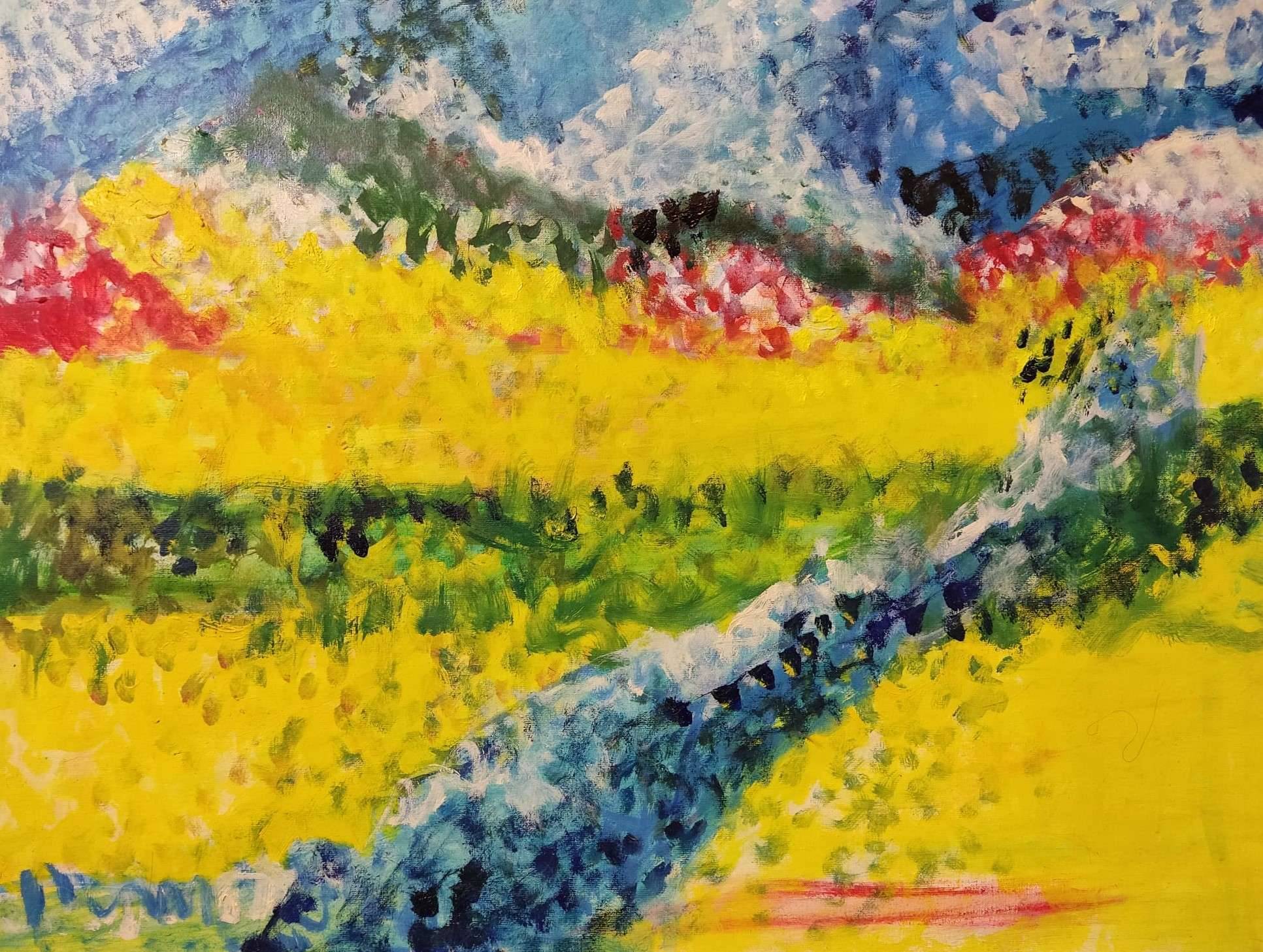 Na obrazie dominują dynamiczne kolory: intensywna żółć, ognista czerwień, chłodny błękit i żywa zieleń. To jak kolorowy obrazek z bajki. Kompozycja jest zaskakująca; plamy barw przeplatają się, tworząc szerokie, migoczące pole żółtych kwiatów. To pole wydaje się nie mieć końca, a intensywne kolory zdają się wchodzić w dialog, jakby kłóciły się o uwagę. Dzieło emanuje energią i spontanicznością. Technika malarska przypomina impresjonizm, gdzie pociągnięcia pędzlem są śmiałe, a formy pozostają niedopowiedziane. W tym chaosie można dostrzec pasję twórcy, a być może również jego chwilowy zachwyt pięknem natury. Odbiorca może poczuć się jak dziecko biegające po łące, czerpiąc radość z prostego bycia tu i teraz. Jest tu coś magicznego, coś, co sprawia, że czujemy zapach kwiatów i słyszymy brzęczenie pszczół. Reakcje? I love it! To coś więcej niż obraz. To wspomnienie lata. Na jednej z czerwonych plam moje oko zatrzymało się dłużej - myślę, że dodaje ono całości ognistego charakteru. Dzieło jest jak radosny sen na jawie. Jakby chciało powiedzieć: spójrz, życie jest pełne kolorów!