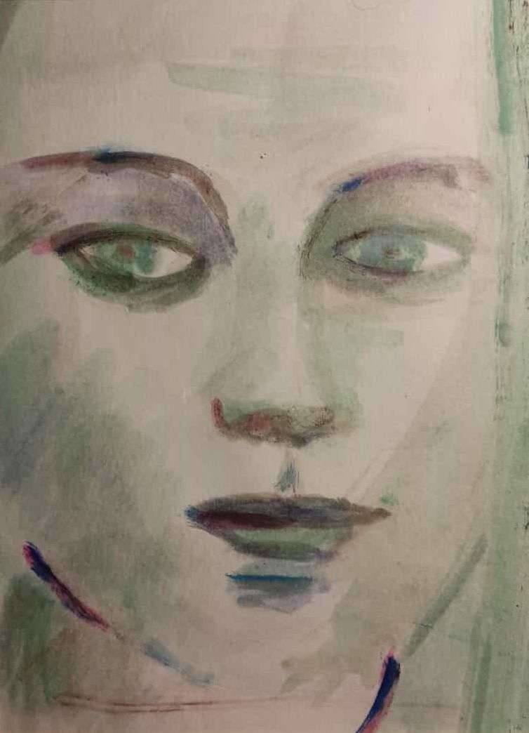 Obraz przedstawia subtelną twarz o delikatnych, rozmytych konturach. Dominuje pastelowa paleta kolorów, składająca się głównie z szarości i zieleni, które płynnie przechodzą jedna w drugą. Choć forma jest raczej abstrakcyjna, można dostrzec wyraziste oczy, które zdają się patrzeć w głąb duszy. Całość tworzy atmosferę tajemniczości, jakby obraz zawierał skrywane emocje. Artysta wykorzystał, z całą pewnością, technikę akwareli, co dodaje całości lekkości i subtelności. Tworzy to wrażenie delikatnego tańca kolorów na płótnie, który uspokaja i jednocześnie intryguje odbiorcę. Twarz na obrazie wydaje się zastanawiać, zadawać pytania bez użycia słów. Może to chwilowe zamyślenie czy tylko moment ulotnej refleksji. A może to po prostu secret, którego nie da się jednocześnie ani w pełni zrozumieć, ani zignorować. Odbiorca czuje swego rodzaju spokój, ale może też lekkość zadumy. Coś w tym spojrzeniu jest, co zapada w pamięć jak najpiękniejsza melodia. Patrząc na to dzieło, czuję, że artysta naprawdę umie bawić się kolorem i formą. Jakby wolna ręka prowadziła pędzel w niewymuszonym tańcu, tworząc harmonię pomiędzy rzeczywistością a abstrakcją. To trochę jakby świat snu i jawy splótł się w jedno na tym płótnie.