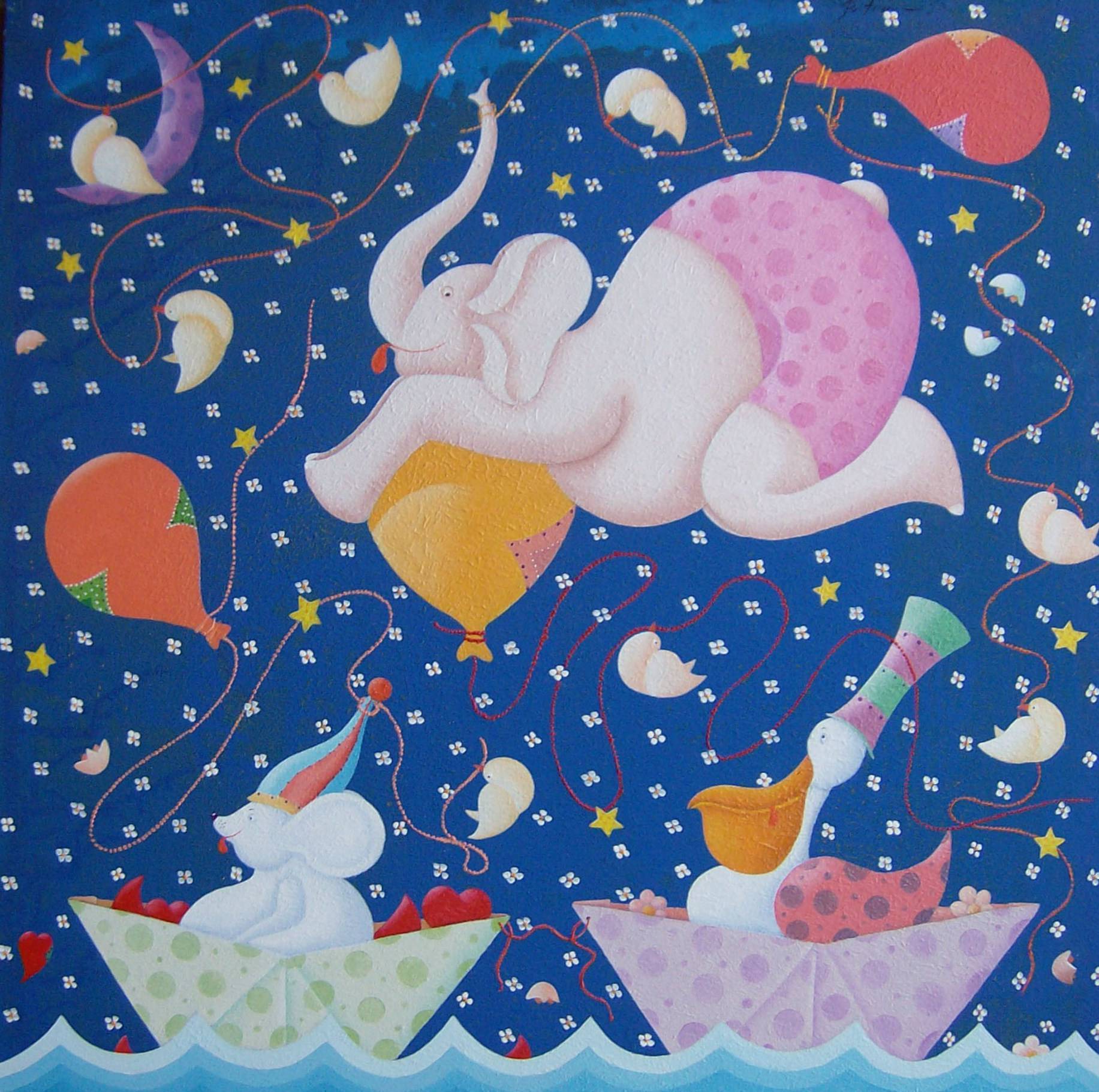Obraz tętni życiem i kolorami. Na niebieskim jak niebo tle unoszą się zabawne figury: różowy słoń z uniesioną trąbą jak mały marzyciel, obok niego białe myszki w kapeluszach płyną na papierowych łódeczkach. Kompozycja jest pełna dynamizmu, a kształty są miękkie i zaokrąglone, co tworzy przyjazny nastrój. Artyście udało się uchwycić coś magicznego, jakby wakacje zamknąć w kadrze. Nutka surrealizmu miesza się z dziecięcą beztroską w stylu whimsical. Wszystko to sprawia, że na twarzy pojawia się uśmiech. Look! Unosi się słoń! Technika użyta przez artystę przypomina grafikę cyfrową, choć mogłaby być wykonana akrylami. Jest w tym coś z bajki opowiedzianej nocą, gdzie wyobraźnia nie zna granic. Obraz przyciąga wzrok i wzbudza radość — taką, jaką czujesz, gdy jako dziecko bezceremonialnie ściągasz z drzewa jabłko. Cieszy cała gama emocji, od zdumienia po czystą radość. Radość rodzajem dziecięcej fantazji. To takie śmieszne, że słonie fruwają na niebie! Obraz bawi i relaksuje, a każdy jego element zachęca do odkrywania raz jeszcze.
