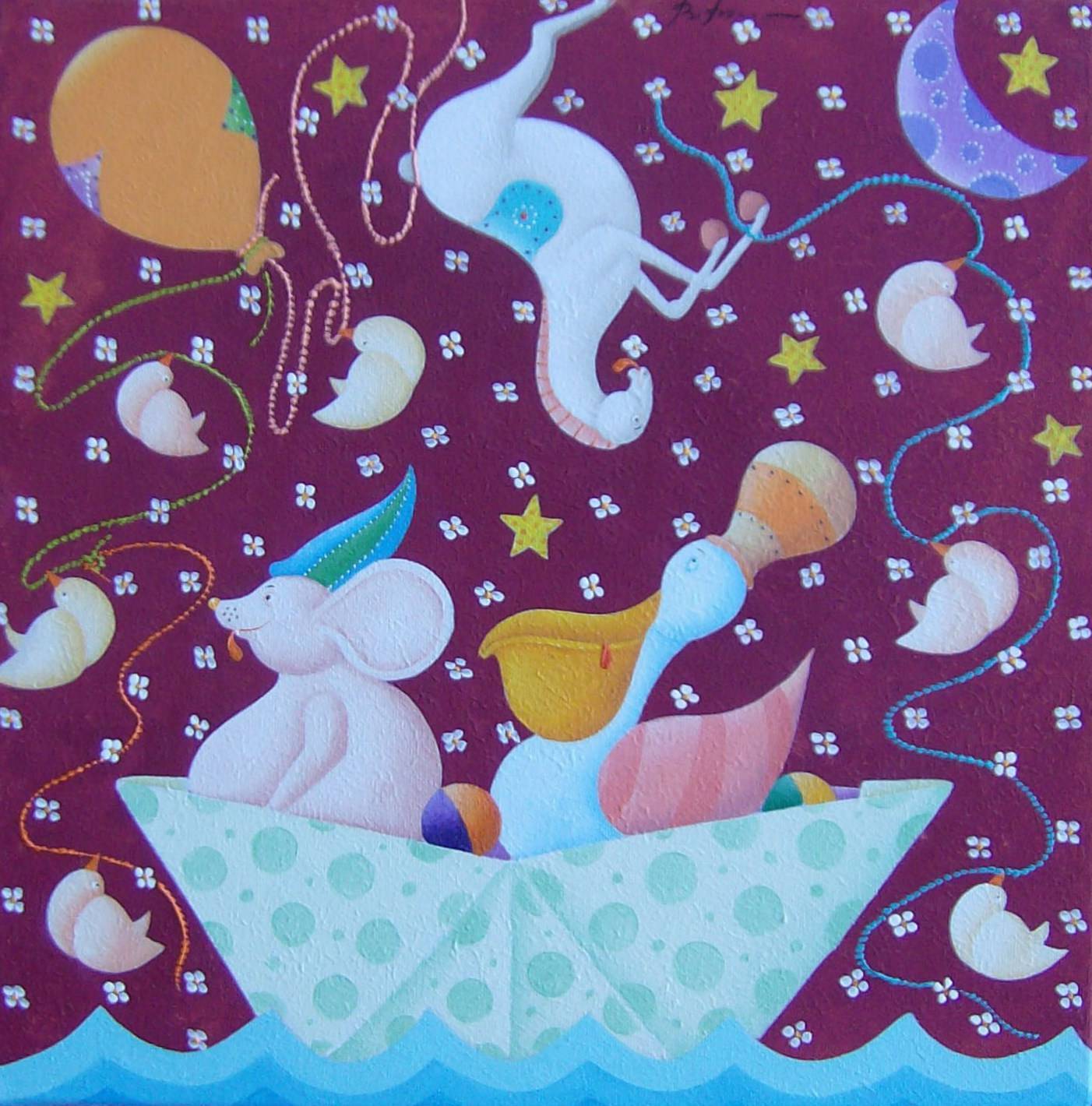 Na obrazie dominuje magiczna kompozycja z kolorowymi postaciami, które unoszą się na tle głębokiego, fioletowego nieba pełnego gwiazd i księżyców. Mysz w zabawnym kapeluszu i pelikan wyglądają na rozbawionych, podróżują łódeczką z papieru po błękitnych falach. Pastelowe barwy, takie jak miętowa zieleń i delikatny róż, tworzą kontrast z czerwonym tłem. Całość jest jak sen niesfornego malucha, ready to pop with possibilities. Artystyczna technika zastosowana przez twórcę to połączenie surrealizmu i bajkowej stylistyki. Wszystko płynie lekko i z humorem. Czy to samoloty z waty cukrowej unoszące się do góry? Małe księżyce z uśmiechniętymi buziami sprawiają, że obraz wydaje się ciepły i beztroski. Dzieło emanuje radosnym, wręcz dziecięcym nastrojem, wywołując u odbiorcy uczucie nostalgii za czasami, kiedy świat był prostszy. "A te kurki są takie śmieszne!" może powiedzieć siedmiolatek. Patrząc na ten obraz, można się poczuć jak w bajkowej odysei, gdzie niemożliwe staje się codziennością. Ten crazy, pełen energii świat przypomina nam, jak ważne są marzenia. I to jest w gruncie rzeczy przepiękne uczucie.