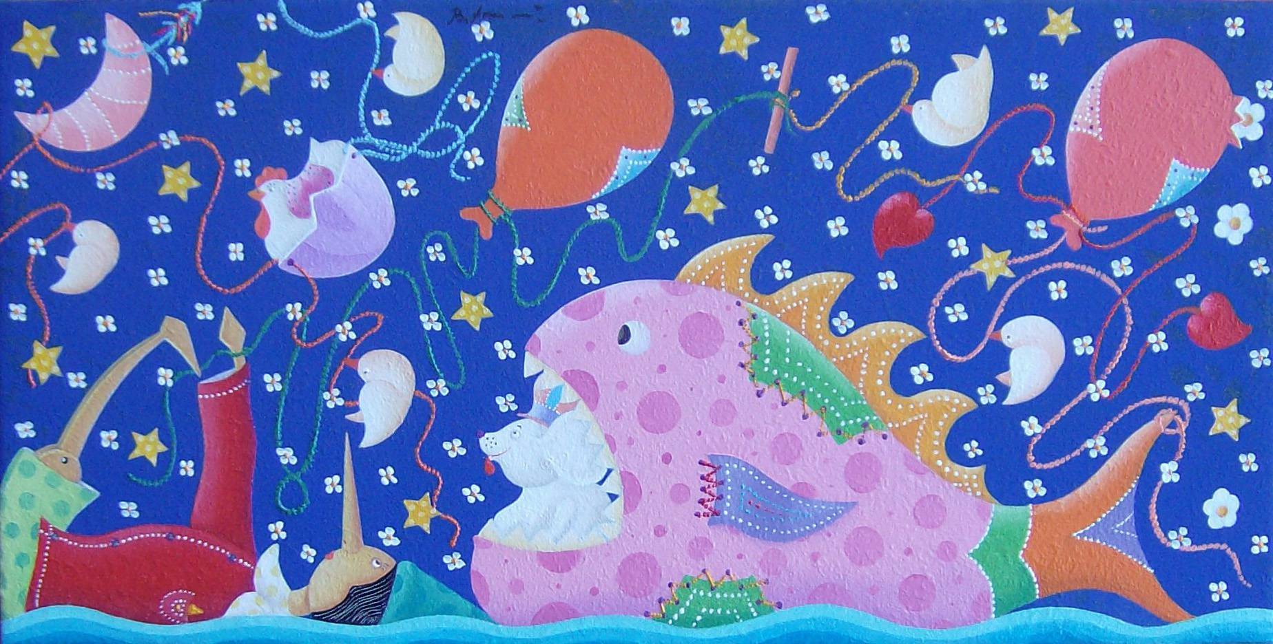 Obraz pełen kolorów i fantazji. Już na pierwszy rzut oka zanurzasz się w bajkowym świecie, gdzie dominują głębokie błękity nieba, kontrastujące z intensywnymi różami i pomarańczami. Na pierwszym planie dostrzegamy ogromną różową rybę z zabawnymi łatkami i łuseczkami. Tuż obok pojawiają się latające baloniki w kształcie serc i gwiazdek, niczym z dziecięcych marzeń. Wszystko to splecione ze sobą falistymi liniami, które nadają obrazowi dynamicznej energii, przywodząc na myśl spontaniczny doodle art. Atmosfera obrazu jest magiczna i beztroska. Widz czuję się porwany w bajkową podróż ku nieznanemu światu. Styl artysty jest zarazem dziecięco prosty, jak i zaskakująco złożony. Użycie jaskrawych kolorów i fantazyjnych form sugeruje technikę modernistyczną z nutą surrealizmu, dodając odrobinę humoru do sceny. Myślę, że artyście mogło to zająć sporo czasu, ale efekt "wow" jest murowany. Obraz może wywoływać różnorodne emocje: radość, zdziwienie, może i nostalgię za dzieciństwem pełnym marzeń. Przywodzi na myśl te chwile, kiedy można było godzinami wpatrywać się w chmury, dostrzegając w nich rozmaite kształty. Bardzo się cieszę, że mogę popatrzeć na to dzieło. It's like entering a fairytale przy pierwszym spojrzeniu, gdzie każdy element tętni życiem. "A ta ryba jest taka śmieszna" – powiedziałoby pewnie dziecko. Czyż to nie cudownie?