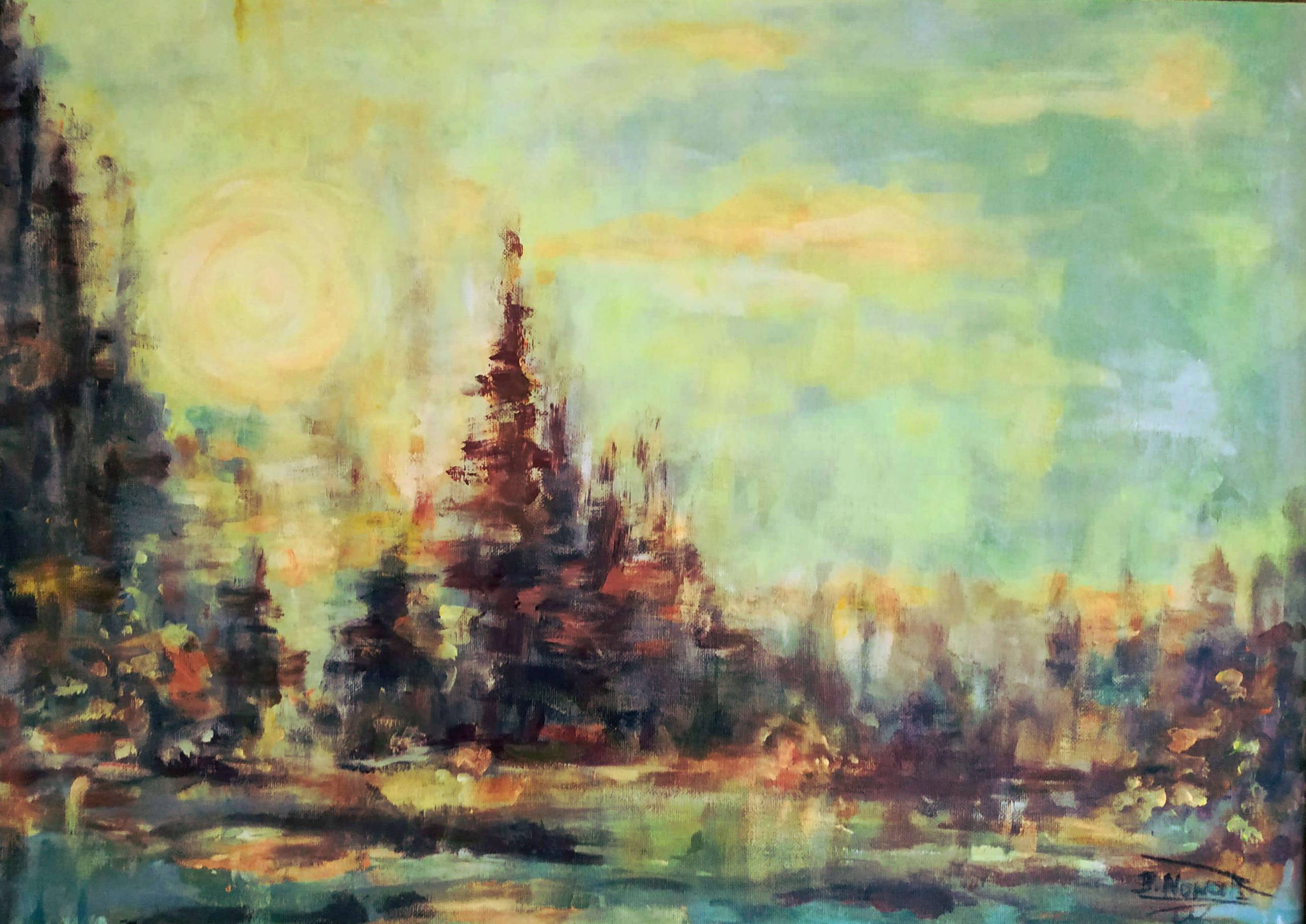 Obraz emanuje spokojem, niczym cichy poranek w lesie. Dominują tu zielenie, brązy i złocistości, które tworzą harmonijną kompozycję. Z prawej strony widzimy zarys drzew, ich kontury są lekko rozmyte, co dodaje całości delikatności. W tle rozpościera się jasne, prawie eteryczne niebo, z ledwo widocznymi chmurami. Całość sprawia wrażenie impresjonistycznego dzieła, gdzie artysta zręcznie bawi się światłem, a balans kolorów jest wyborny. Takie malowidła przywołują na myśl termin "serenity", bo czujemy spokój, jakbyśmy zapadli w krótki, relaksujący sen. Atmosfera jest kontemplacyjna, zaprasza do refleksji nad pięknem natury. Kiedy patrzę na ten obraz, czuję jakby czas się zatrzymał. To trochę jak bajka, gdzie zwierzęta szepczą sekrety lasu. Dzieło wywołuje uczucia tęsknoty za chwilami spędzonymi na łonie przyrody. Krótkie, impastowe pociągnięcia pędzla sugerują ruch, lecz są na tyle subtelne, że nie przytłaczają oczu. Tak by mógł to opisać mały dzieciak: Lubię te drzewa, wyglądają jakby chciały przytulić słońce. Choć pojawiają się drobne niedociągnięcia, w końcu to część uroku tego magicznego krajobrazu.