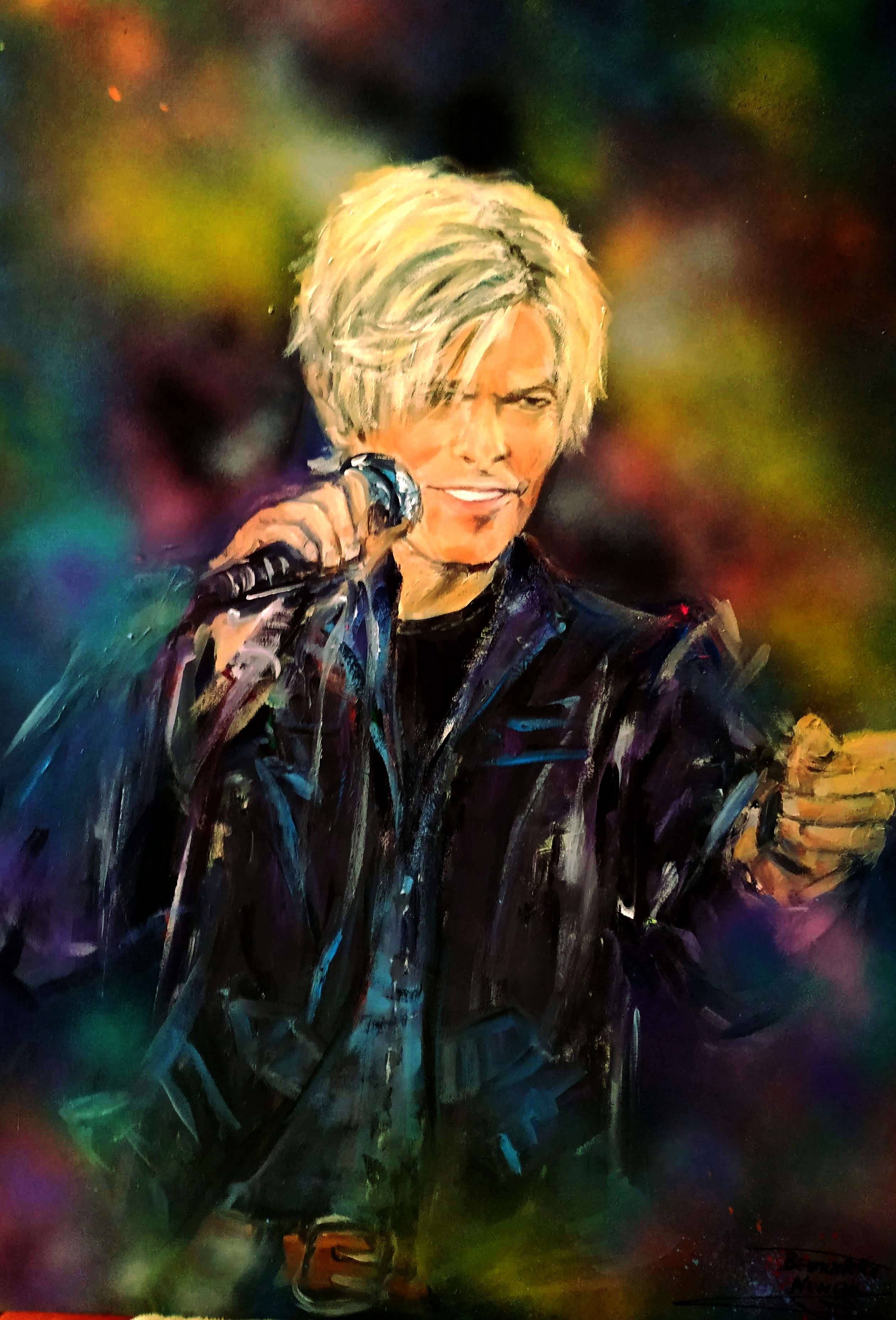 Dynamiczny portret przedstawia postać na scenie zanurzoną w palecie nasyconych barw. Dominują tu zielenie, fiolety i odcienie złota, tworząc pulsujący, energetyczny klimat. Ta mieszanina kolorów nadaje obrazowi niepowtarzalny charakter, łącząc w sobie haos i harmonię. Postać trzyma mikrofon w dłoni, a jej uśmiech i pewna siebie postawa zdradzają prawdziwego artystę w swoim żywiole. Look, kolorowe światła reflektorów dodają temu wszystkiemu dodatkowego blasku. Artysta wykorzystał technikę, która zdaje się być połączeniem ekspresjonizmu i impresjonizmu, z luźnymi pociągnięciami pędzla, które wskazują na dynamizm chwili. Co za energia! Obecny na obrazie nastrój podekscytowania i ekstazy może wywołać u odbiorcy uczucie radości i nostalgii za momentami koncertowej magii. Osoba patrząca na ten obraz może poczuć, jakby była częścią widowni, chcąc zatracić się w rytmie muzyki. Ja też chcę tam być! Dla siedmiolatka, to wygląda jak ktoś, kto śpiewa i jest bardzo szczęśliwy. Ekspresja twarzy i gesty postaci wskazują na miłość do muzycznej sceny, zachęcając do wiary w moc dźwięków i emocji.