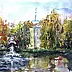 Obraz przedstawia spokojny pejzaż parku z dominującymi barwami jesieni. Bogactwo kolorów – od złocistych odcieni żółci do głębokiej czerwieni – nadaje kompozycji ciepły i nostalgiczny nastrój. Pośrodku malowniczego widoku rozciąga się staw, którego powierzchnia odbija otaczające go drzewa. Odbicia w wodzie tworzą wrażenie ruchu, jakby zapraszały do zanurzenia się w tej magicznej naturze. Artysta zastosował technikę akwareli, co widać w subtelnych przejściach między kolorami. Lekko rozmyte kontury nadają całości delikatności i eteryczności. Takie podejście sprawia, że obraz zdaje się niemal "żywy", kipiący energią chwili uchwyconej na papierze. Oglądając to dzieło, można poczuć spokój i harmonię z otaczającą przyrodą. Pomyślałem sobie: "To miejsce to prawdziwy sanctuary dla duszy". Dziecko mogłoby powiedzieć: "Lubię fontannę, bo wygląda jakby zabawka tańczyła na wodzie". Coś w tym obrazie jest magicznego, jakby zapraszał do marzeń i refleksji. Zastanawiam się, czy nie chciałbym kiedyś odwiedzić takiego miejsca. Wow.