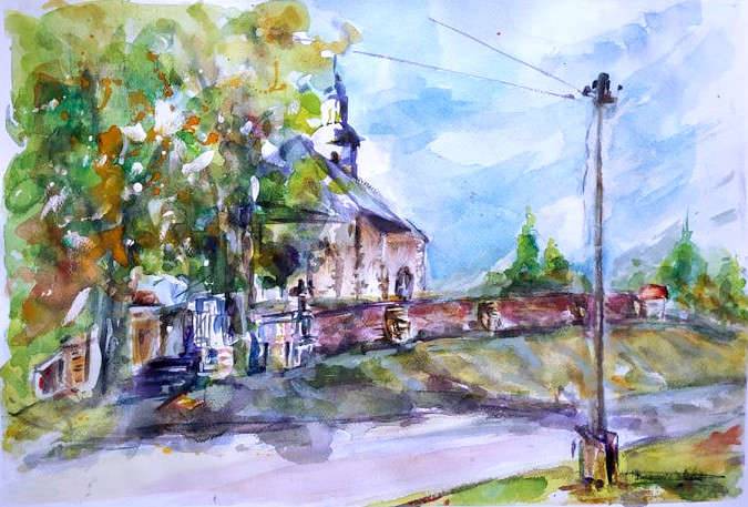 Obraz jest wykonany techniką akwareli, co nadaje mu lekkości i subtelności. Dominują tu delikatne odcienie niebieskiego i zieleni, przeplatane ciepłymi tonami brązu i żółci, co wspaniale oddaje nastrój spokojnego, letniego dnia. Kompozycja obrazu jest harmonijna, z dobrze zbalansowanymi elementami jak kościół po lewej stronie oraz filigranowy słup elektryczny po prawej. Artysta z dużą precyzją oddaje detaly krajobrazu, jednak robi to w lekko rozmyty sposób, charakterystyczny dla watercolor. Atmosfera bijąca z obrazu jest nostalgiczna, jakbyśmy patrzyli na moment z przeszłości. Czuje się tu spokój, ciszę, a nawet lekki powiew letniego wiatru. To miejsce przypomina sielskie wakacje na wsi, no i ten zapach trawy po deszczu! Stylem przypomina nieco impresjonizm dzięki dynamicznym pociągnięciom pędzla i rozmytym konturom. Obraz może wzbudzać różnorodne emocje. Dla jednych będzie to nostalgia za utraconym czasem, dla innych moment zadumy, a jeszcze inni poczują zwykłą radość spowodowaną beztroskim wyglądem prezentowanej scenerii. Dla dziecka to może być jak "fajna zabawa w błocie". Jest coś magical w sposobie, w jaki obraz oddziałuje na widza, zapraszając go do zamyślenia i osobistych refleksji.