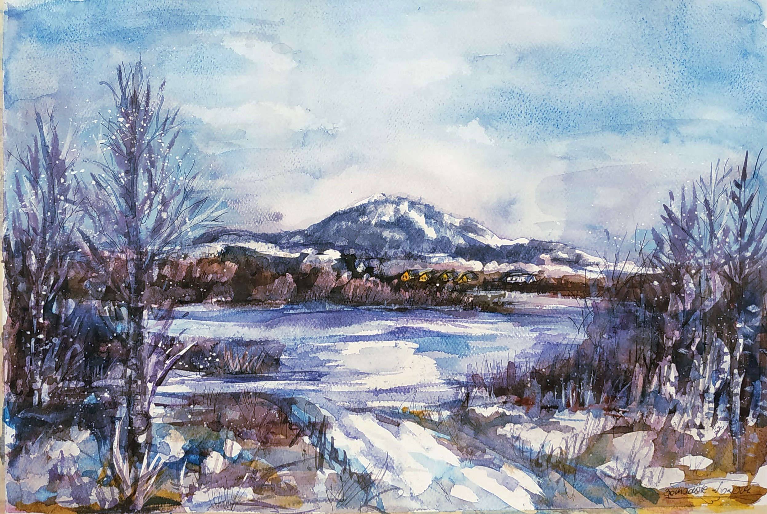 Obraz przedstawia zimowy pejzaż, który od razu przyciąga wzrok swoją delikatną paletą kolorów. Dominują tu chłodne błękity i subtelne fiolety, przeplatane odcieniami bieli. Wszystko to tworzy harmonijną kompozycję, w której centralnym punktem jest ośnieżona góra na horyzoncie. Nad całością unosi się delikatna mgiełka, dodając mistycznej atmosfery. Hmm, śnieg wygląda jak cukier puder. Łącząc akwarelową technikę z dynamicznymi pociągnięciami pędzla, artysta tworzy wrażenie ruchu w nieruchomej scenerii. To przyjemne połączenie precyzji i wolności wyrazu. Nastrój obrazu jest spokojny, niemal kontemplacyjny. Odbiorca może poczuć się jakby stał na skraju jeziora, wpatrując się w odbicie gór i nieba. Artystyczna technika użyta tutaj to prawdziwy "masterpiece". Jest tu coś tajemniczego, co zachęca do zatrzymania się na chwilę – może nostalgia za minionymi zimami czy prostą radość z piękna natury. Ten obraz, choć tak prosty w formie, jest bogaty w emocje. Widzowie mogą poczuć nie tylko spokój, ale też pewną tęsknotę za czymś nieokreślonym, jakby chciało się wrócić do chwili sprzed lat.