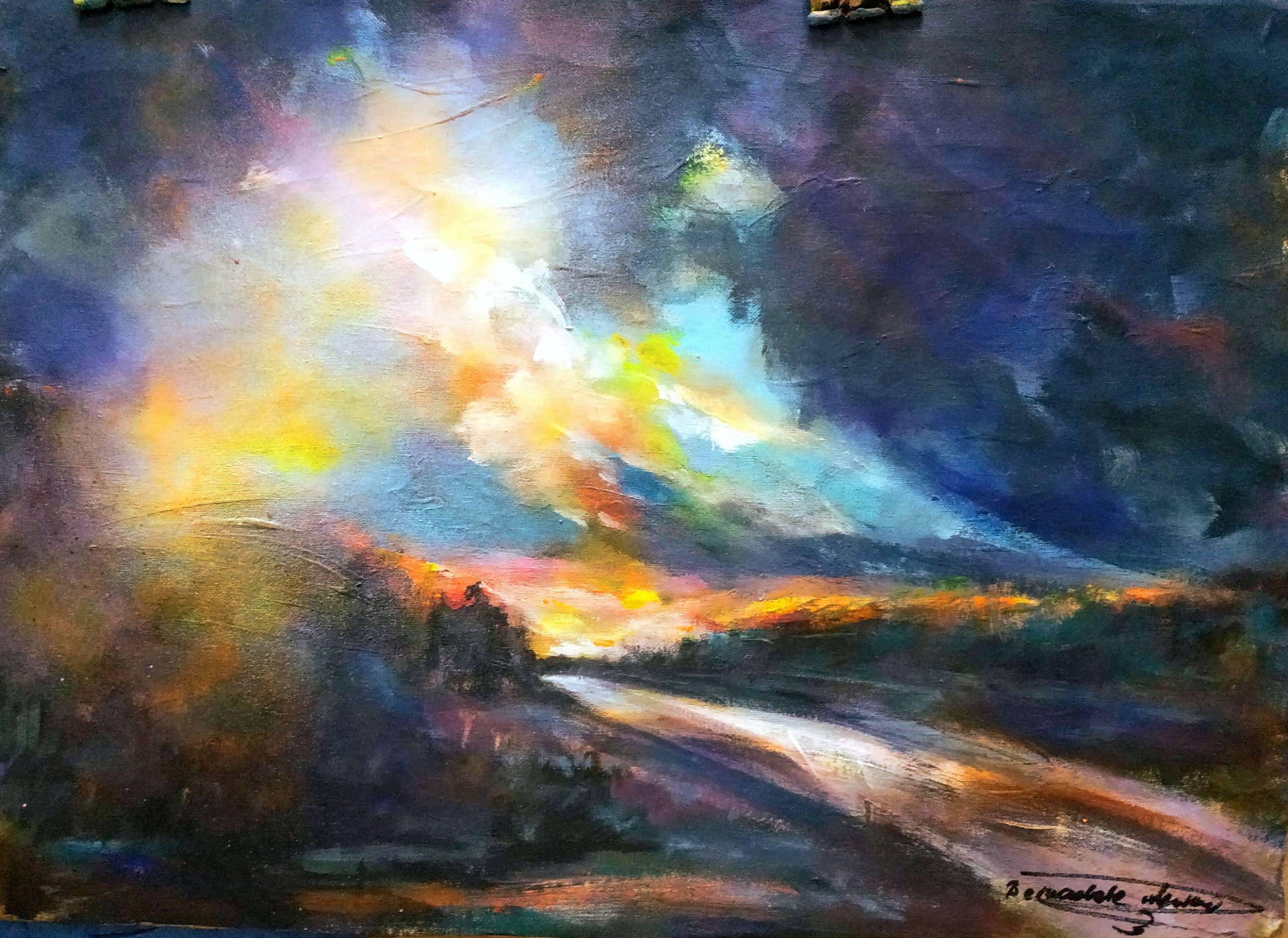 Obraz emanuje nieziemskim blaskiem, przypomina niebo tuż o zachodzie słońca, gdy światło rozpływa się w rozmytych, kolorowych plamach. Paleta barw jest niezwykle bogata, od ciepłych pomarańczy i żółci przez chłodne błękity i fiolety, co tworzy dynamiczną i jednocześnie spokojną kompozycję. Te kolory naprawdę przyciągają wzrok. Centrum uwagi to rozjaśniony punkt na horyzoncie, od którego rozchodzą się linie niczym promienie światła. Wygląda to trochę jak spektakularny spektakl natury. Atmosfera jest magiczna i niemal tajemnicza. Obraz pobudza wyobraźnię, sprawiając, że odbiorca przenosi się w świat pełen przygód i niepoznanych miejsc. Widz może poczuć się jak w drodze do marzeń, pełnej nieodkrytych ścieżek. W stylu artystycznym czuć rękę impresjonisty – luźne pociągnięcia pędzla, które w swojej pozornej przypadkowości tworzą spójną i ukojoną całość.